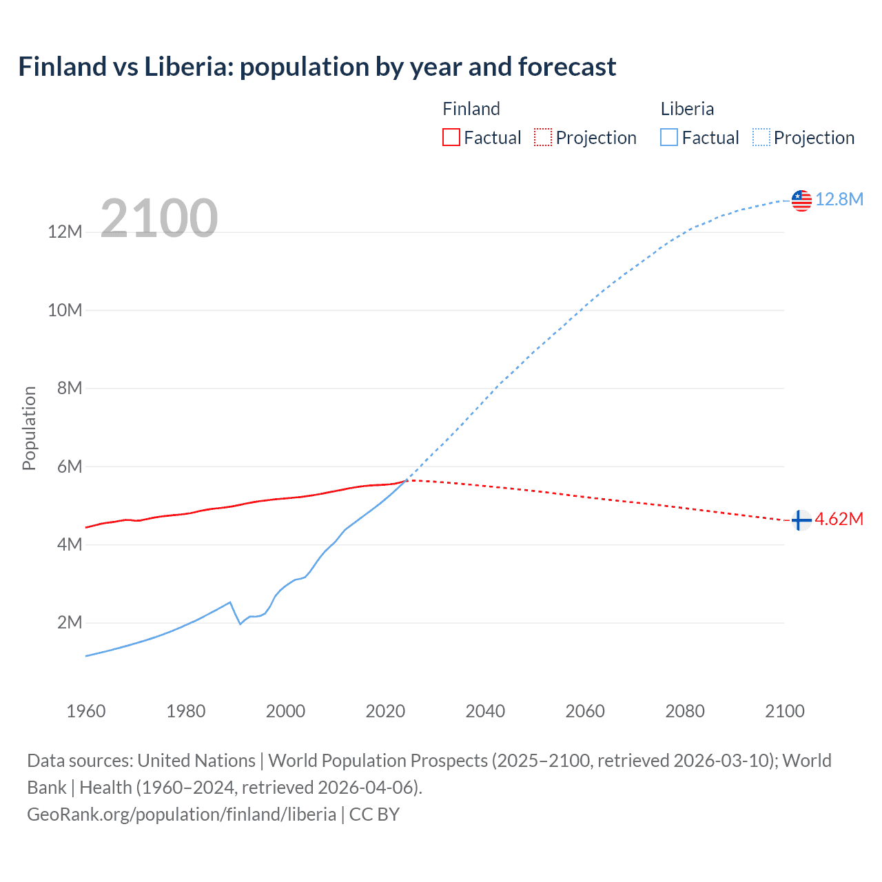 The latest officially reported population of Finland was 5,619,911 in 2024 vs 5,612,817 people in Liberia in 2024. In 2026, based on the adjusted UN estimation, the current Finland's population is 5,631,965 people compared to 5,887,000 in Liberia.