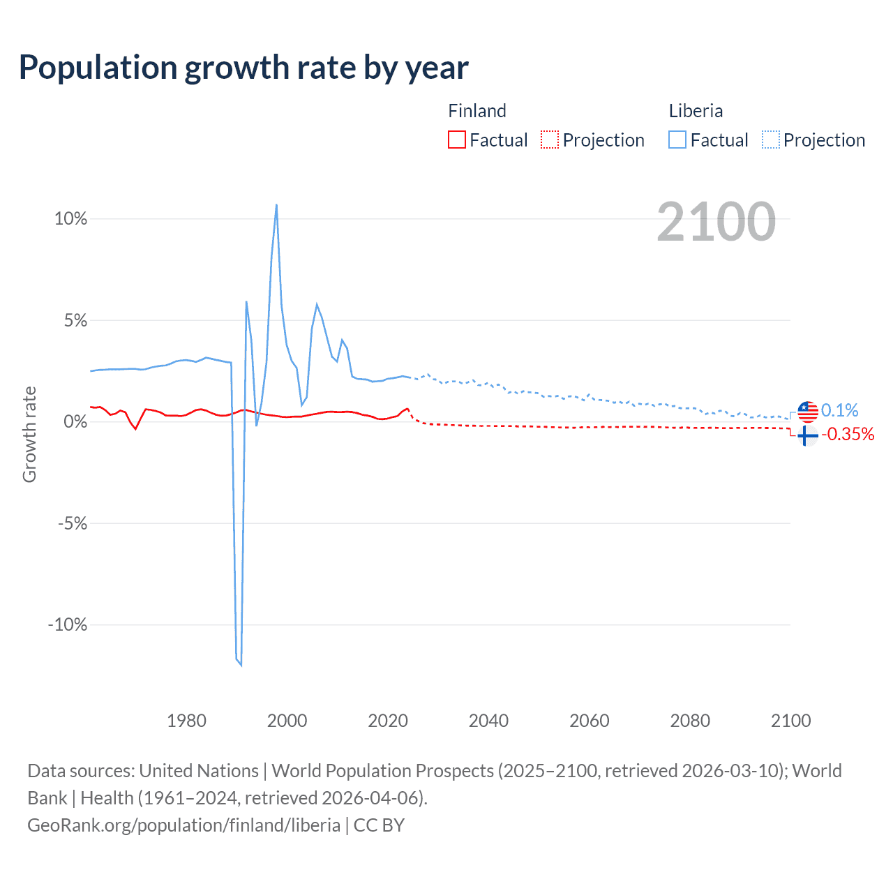 - For the last 10 years, Finland has had an average growth rate of +0.3% per year vs +2.09% in Liberia.