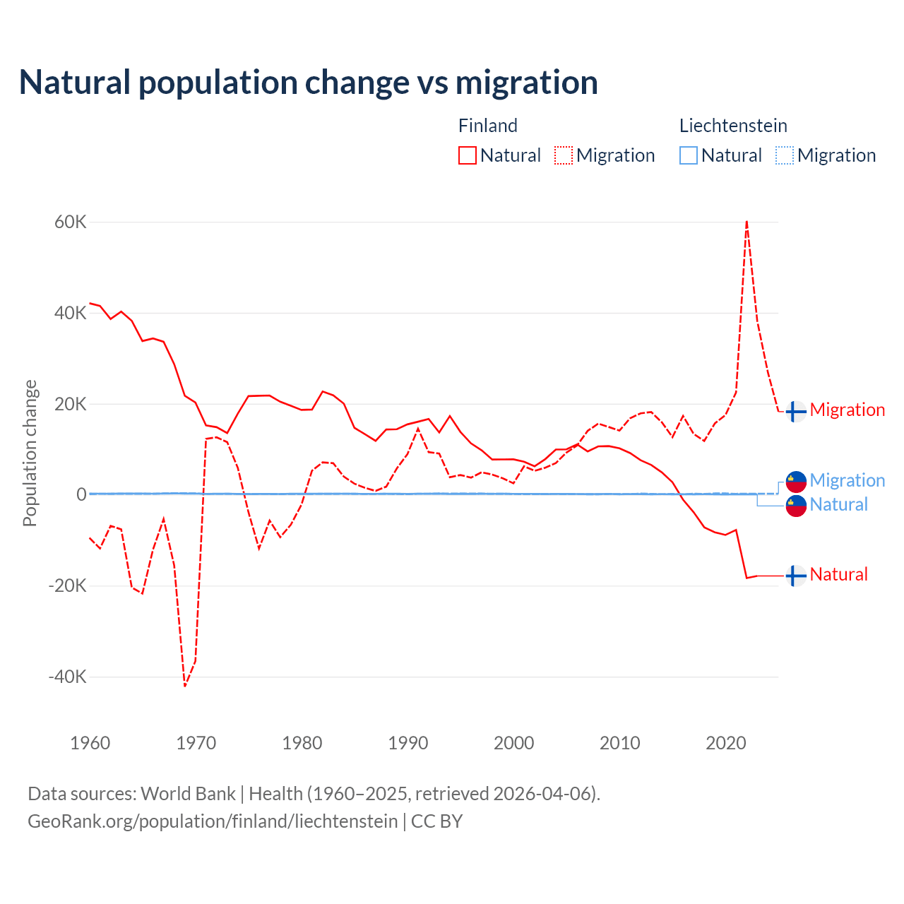 Over the last 10 years, 22.5% of the population change in Finland is from natural causes (a loss of 65,560 people) and 77.5% is from migration (a gain of 225,237 people). In Liechtenstein 32.4% is from natural causes (a gain of 883 people) and 67.6% is from migration (a gain of 1,843 people).