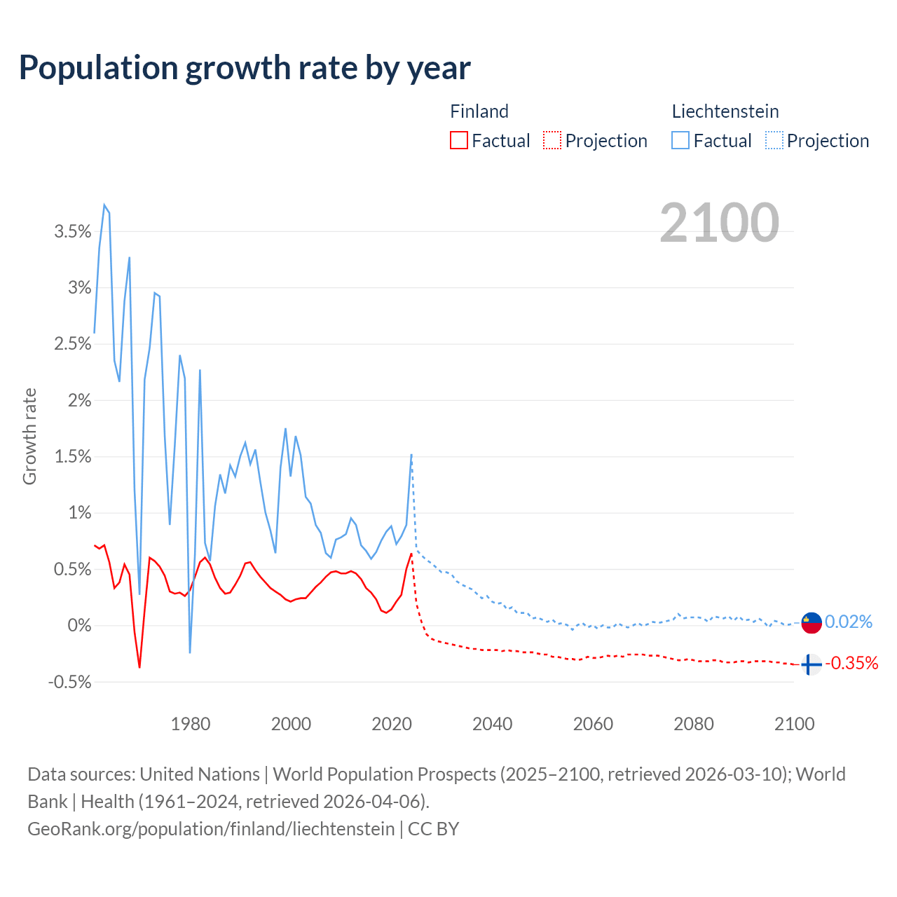 - For the last 10 years, Finland has had an average growth rate of +0.3% per year vs +0.82% in Liechtenstein.