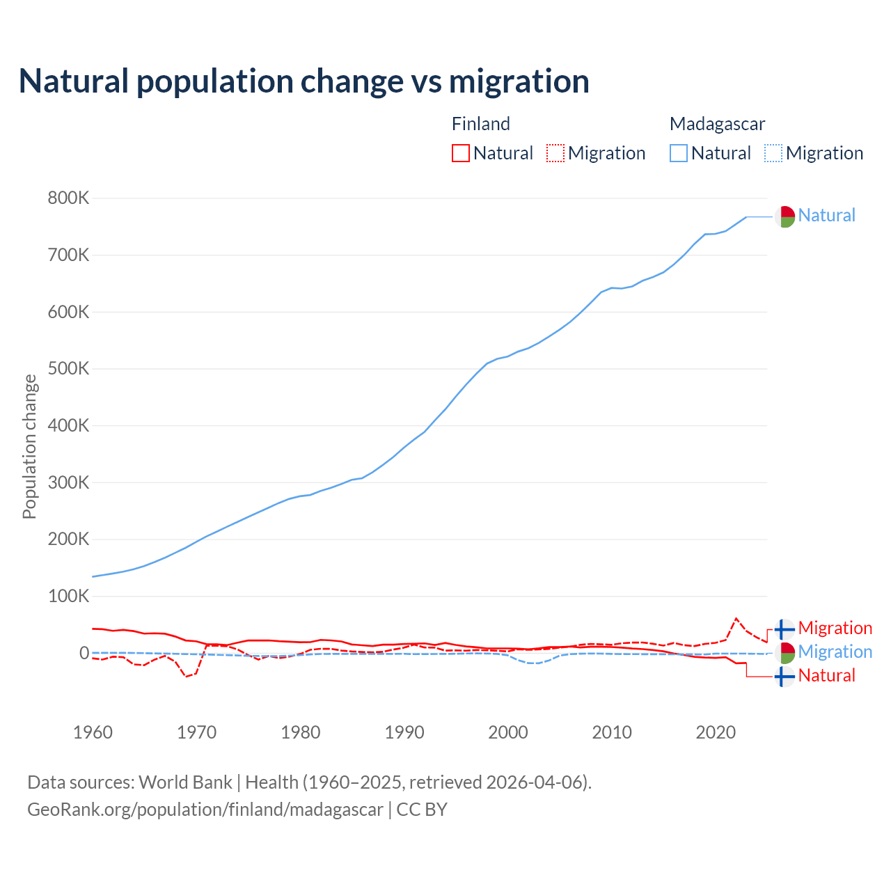 Over the last 10 years, 22.5% of the population change in Finland is from natural causes (a loss of 65,560 people) and 77.5% is from migration (a gain of 225,237 people). In Madagascar 99.7% is from natural causes (a gain of 7,165,578 people) and 0.31% is from migration (a loss of 22,384 people).