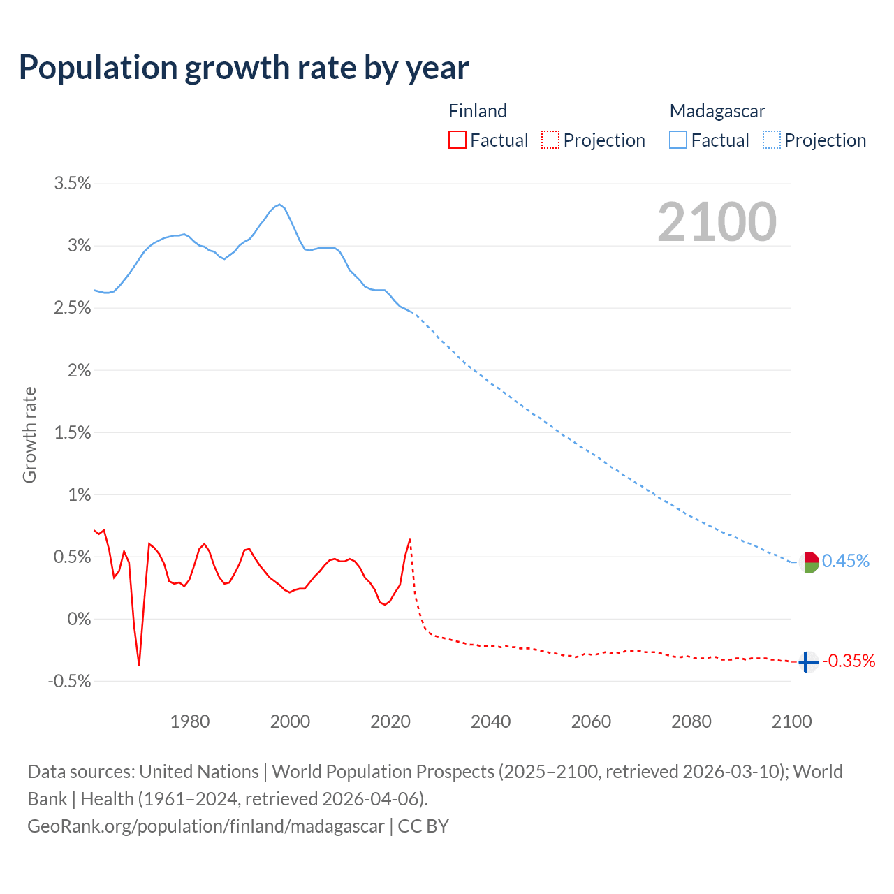 - For the last 10 years, Finland has had an average growth rate of +0.3% per year vs +2.6% in Madagascar.