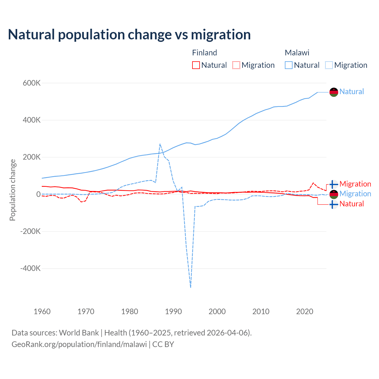 Over the last 10 years, 22.5% of the population change in Finland is from natural causes (a loss of 65,560 people) and 77.5% is from migration (a gain of 225,237 people). In Malawi 99.3% is from natural causes (a gain of 5,019,393 people) and 0.67% is from migration (a loss of 33,768 people).