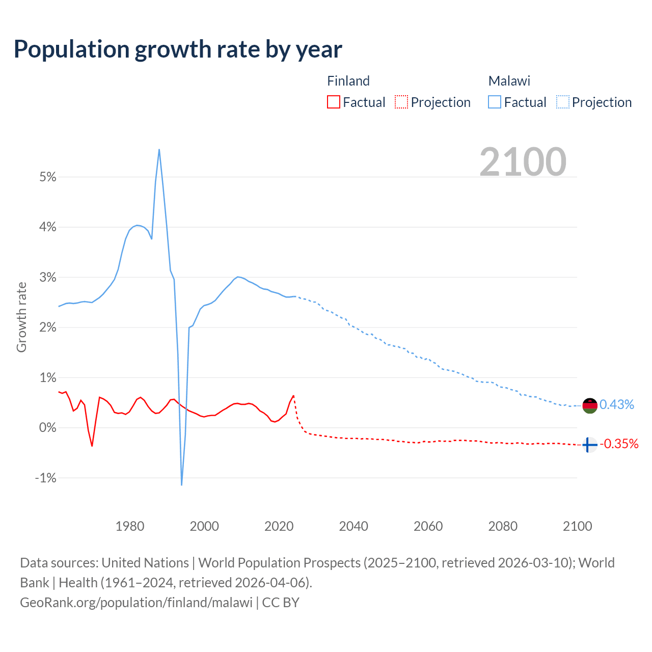 - For the last 10 years, Finland has had an average growth rate of +0.3% per year vs +2.7% in Malawi.