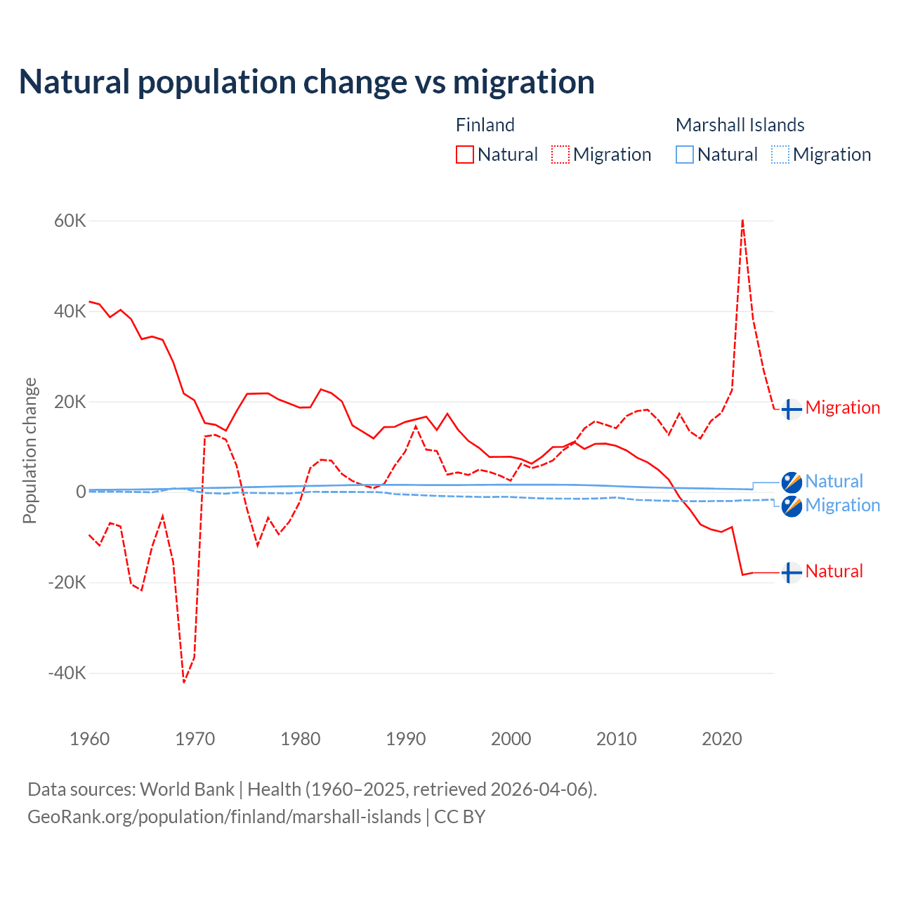 Over the last 10 years, 22.5% of the population change in Finland is from natural causes (a loss of 65,560 people) and 77.5% is from migration (a gain of 225,237 people). In the Marshall Islands 27.8% is from natural causes (a gain of 7,592 people) and 72.2% is from migration (a loss of 19,682 people).