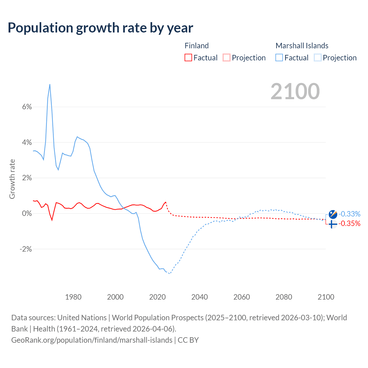 - For the last 10 years, Finland has had an average growth rate of +0.3% per year vs -2.69% in the Marshall Islands.
