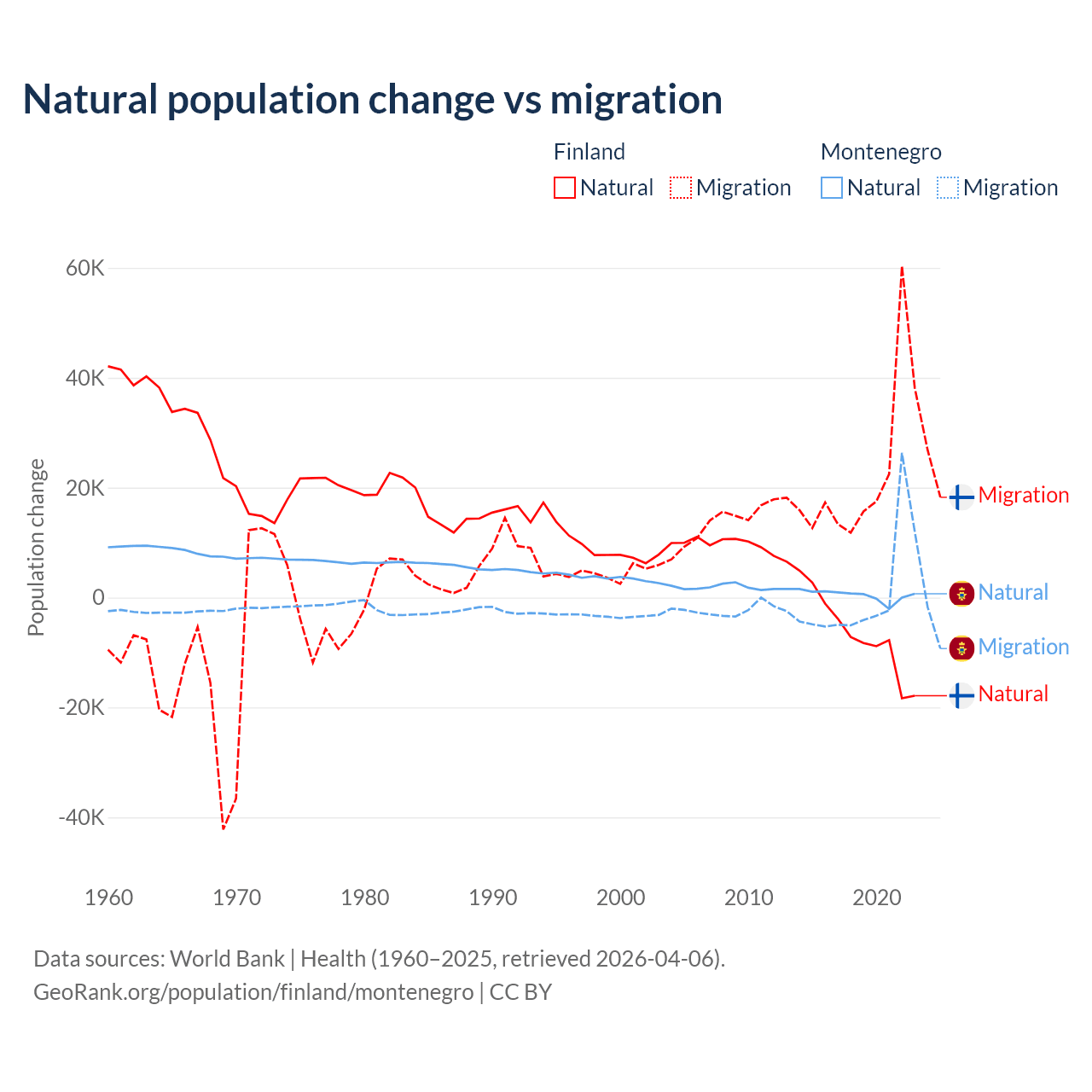 Over the last 10 years, 22.5% of the population change in Finland is from natural causes (a loss of 65,560 people) and 77.5% is from migration (a gain of 225,237 people). In Montenegro 52.4% is from natural causes (a gain of 4,501 people) and 47.6% is from migration (a gain of 4,095 people).