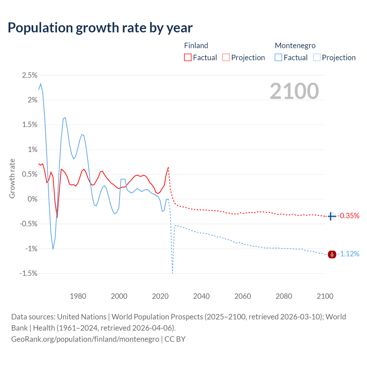 - For the last 10 years, Finland has had an average growth rate of +0.3% per year vs +0.01% in Montenegro.