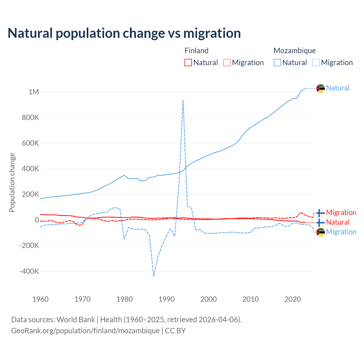 Over the last 10 years, 22.5% of the population change in Finland is from natural causes (a loss of 65,560 people) and 77.5% is from migration (a gain of 225,237 people). In Mozambique 95.9% is from natural causes (a gain of 9,108,203 people) and 4.15% is from migration (a loss of 393,923 people).