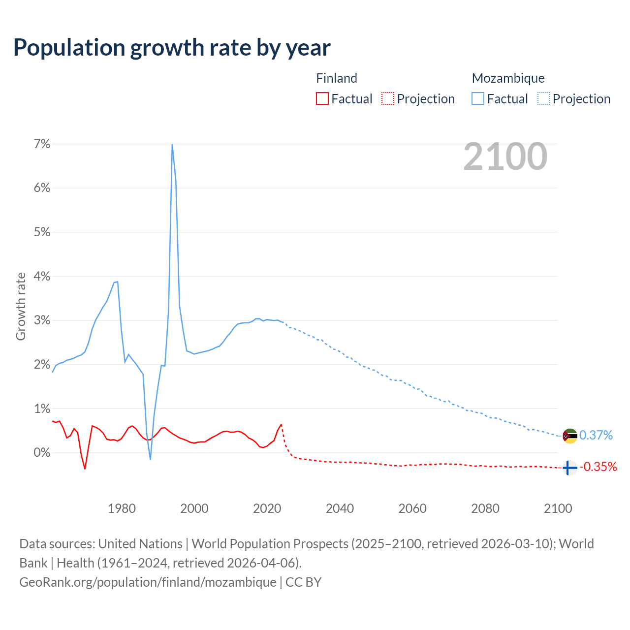- For the last 10 years, Finland has had an average growth rate of +0.3% per year vs +2.99% in Mozambique.