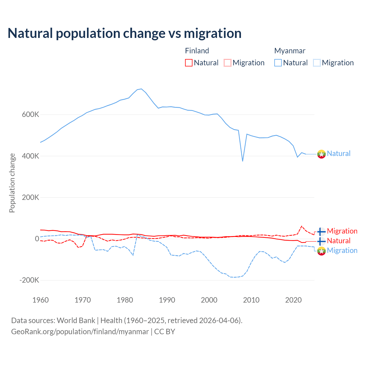Over the last 10 years, 22.5% of the population change in Finland is from natural causes (a loss of 65,560 people) and 77.5% is from migration (a gain of 225,237 people). In Myanmar 86% is from natural causes (a gain of 4,594,615 people) and 14% is from migration (a loss of 749,272 people).