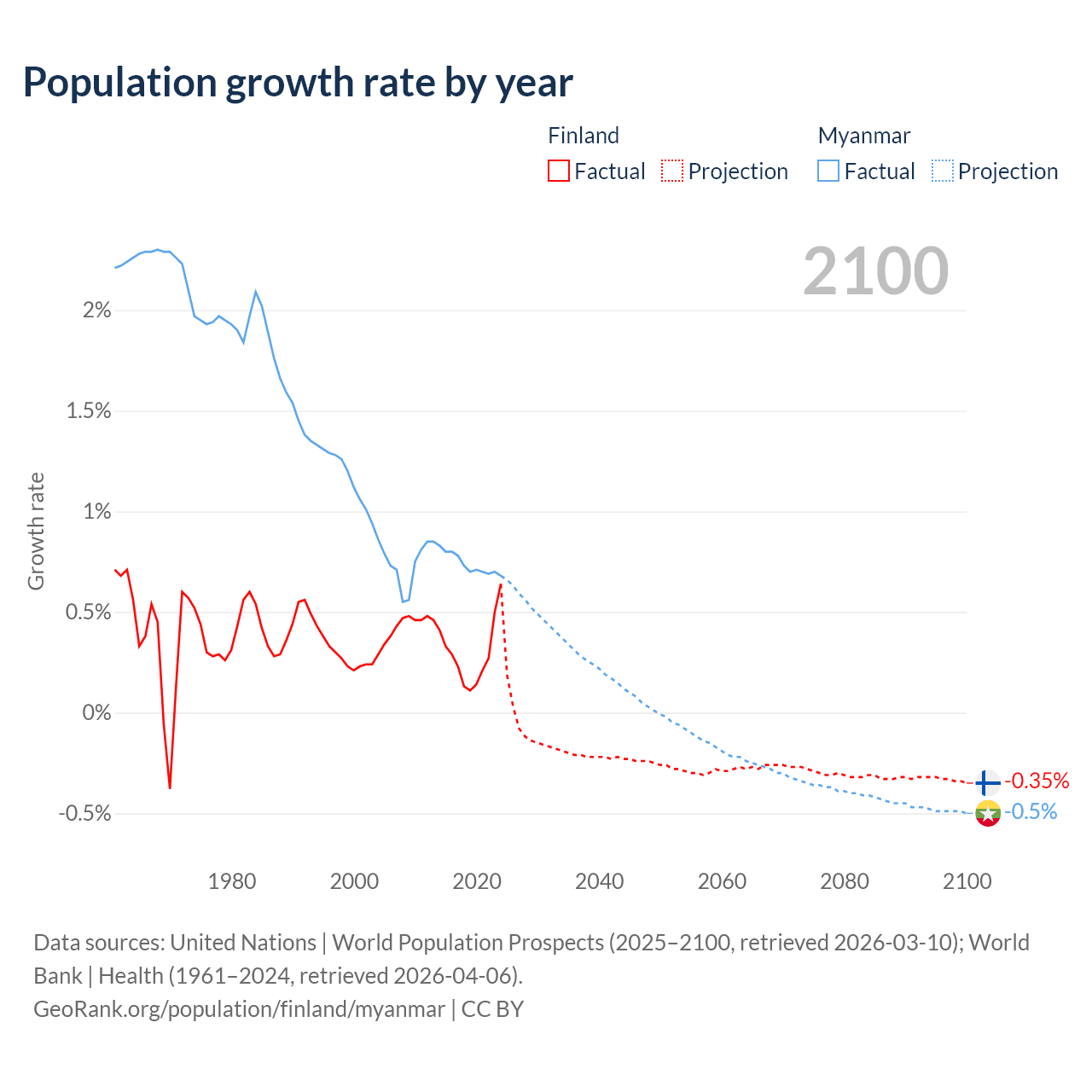 - For the last 10 years, Finland has had an average growth rate of +0.3% per year vs +0.74% in Myanmar.
