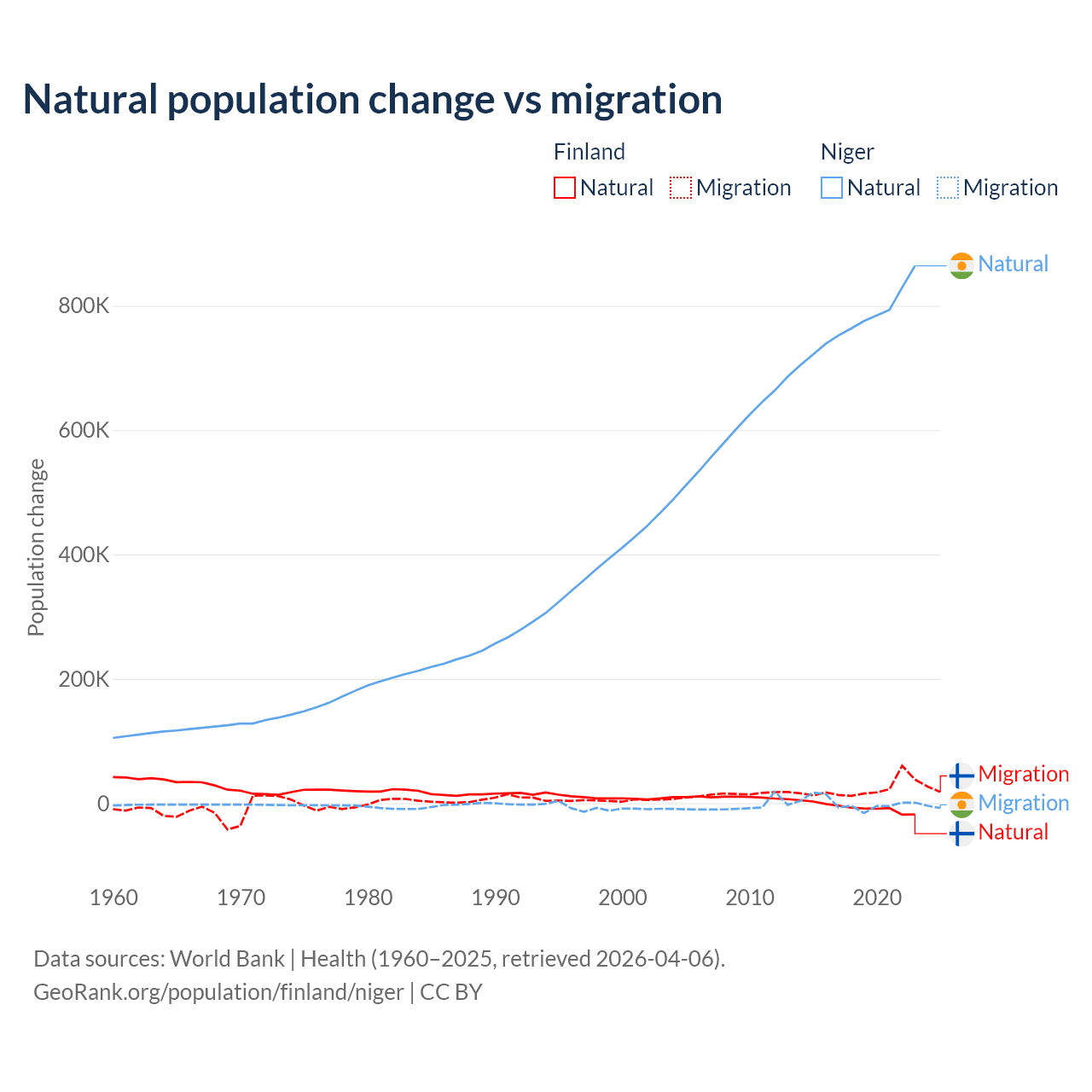 Over the last 10 years, 22.5% of the population change in Finland is from natural causes (a loss of 65,560 people) and 77.5% is from migration (a gain of 225,237 people). In Niger 100% is from natural causes (a gain of 7,728,287 people) and 0.03% is from migration (a gain of 2,520 people).