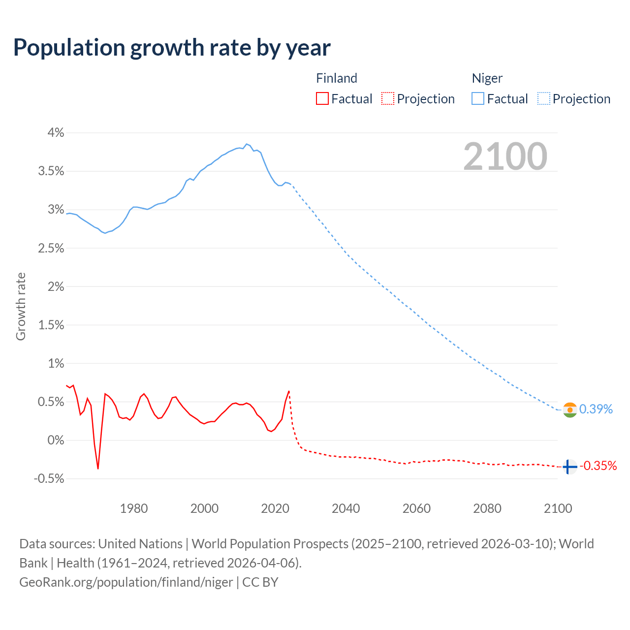 - For the last 10 years, Finland has had an average growth rate of +0.3% per year vs +3.5% in Niger.