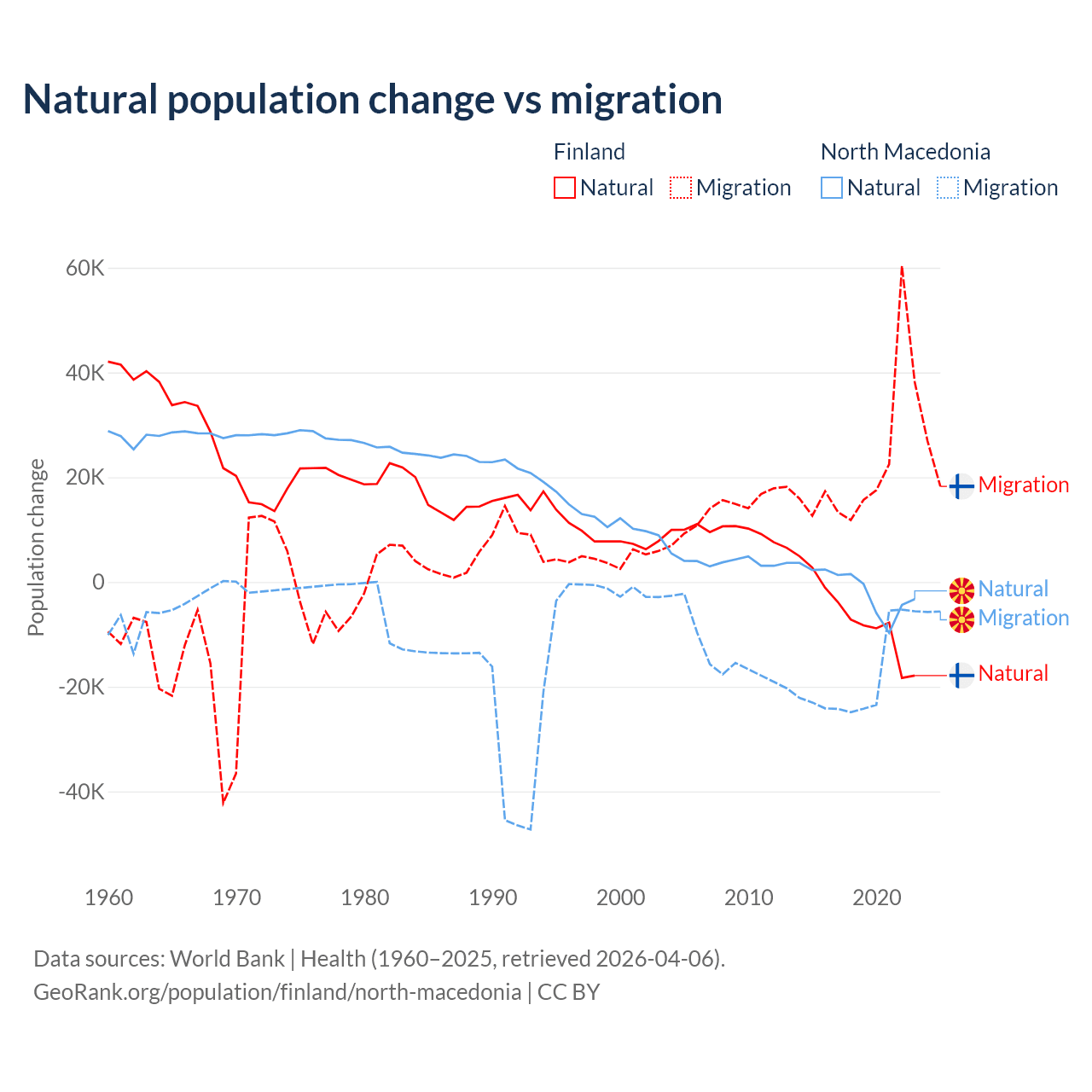 Over the last 10 years, 22.5% of the population change in Finland is from natural causes (a loss of 65,560 people) and 77.5% is from migration (a gain of 225,237 people). In North Macedonia 6.45% is from natural causes (a loss of 12,585 people) and 93.5% is from migration (a loss of 182,429 people).