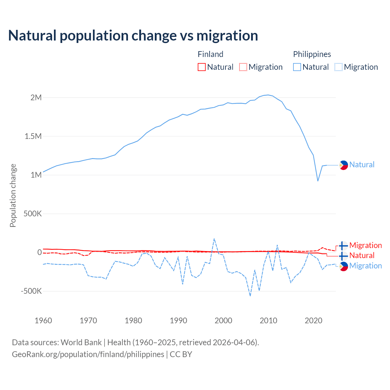 Over the last 10 years, 22.5% of the population change in Finland is from natural causes (a loss of 65,560 people) and 77.5% is from migration (a gain of 225,237 people). In the Philippines 88.5% is from natural causes (a gain of 14,279,705 people) and 11.5% is from migration (a loss of 1,848,117 people).