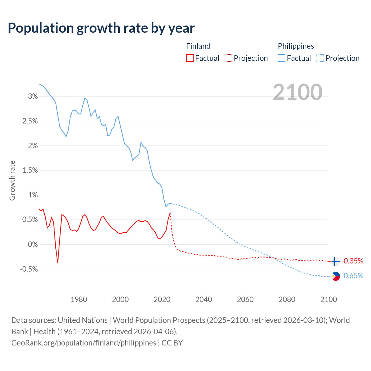 - For the last 10 years, Finland has had an average growth rate of +0.3% per year vs +1.16% in the Philippines.