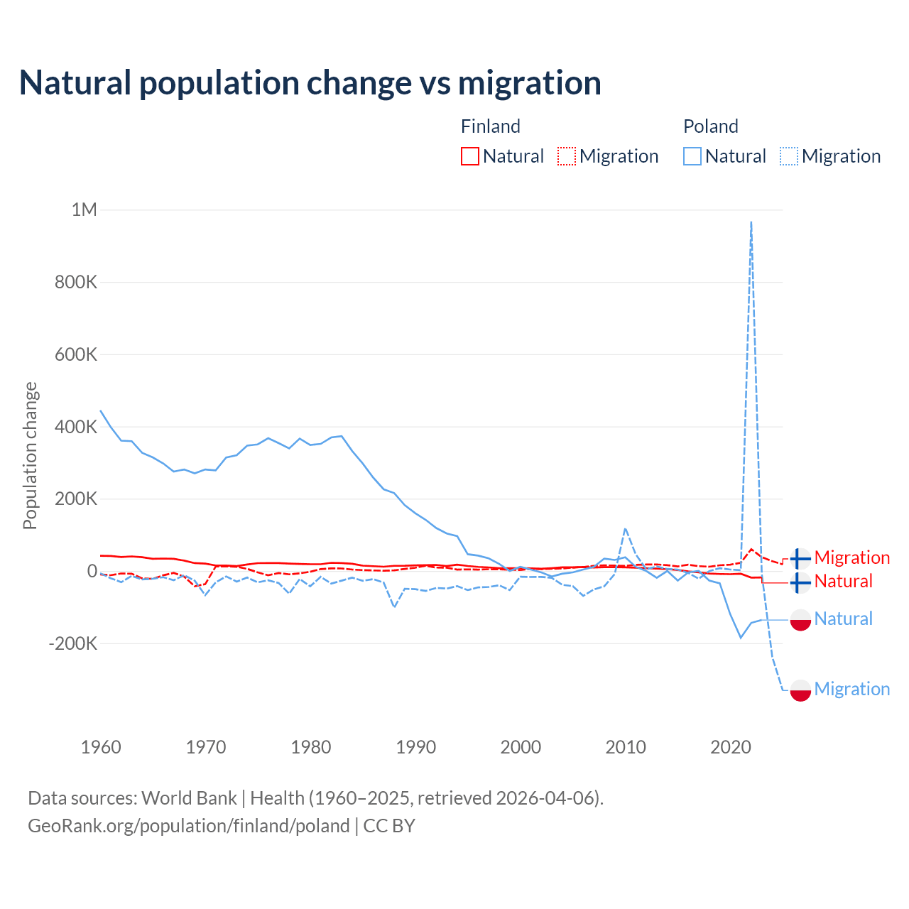 Over the last 10 years, 22.5% of the population change in Finland is from natural causes (a loss of 65,560 people) and 77.5% is from migration (a gain of 225,237 people). In Poland 41.4% is from natural causes (a loss of 675,443 people) and 58.6% is from migration (a gain of 955,766 people).