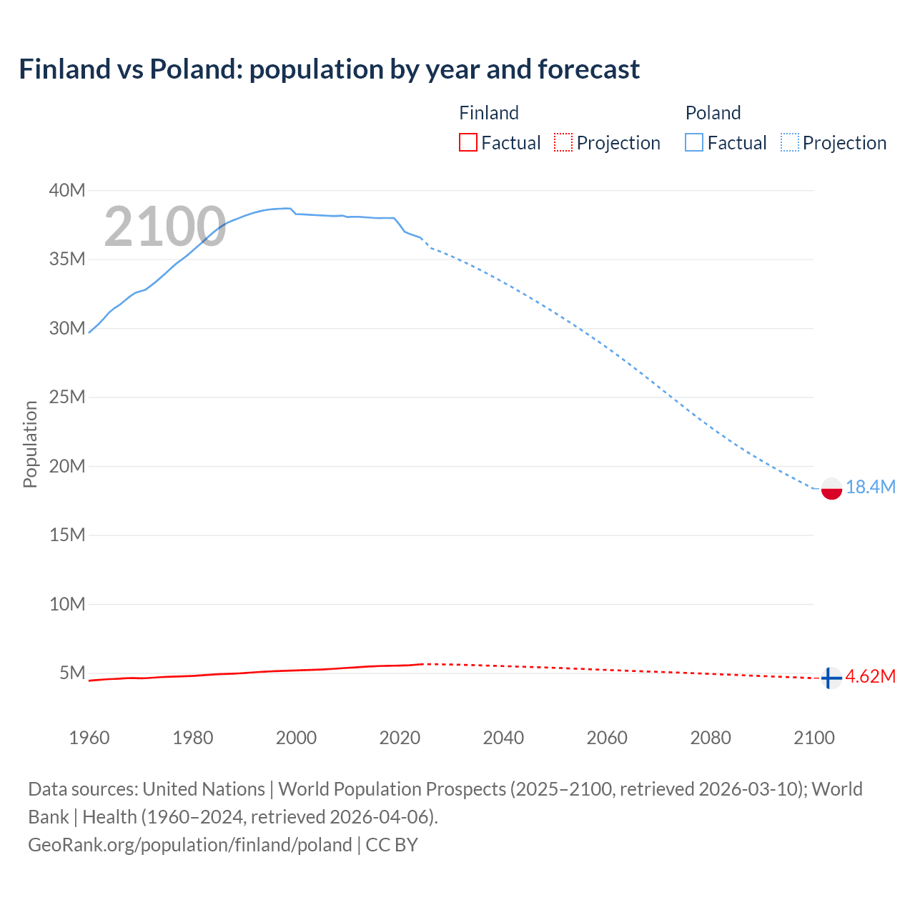 - Since 2006, the population of Finland has increased from 5.27M people to 5.63M (6.94% growth), while Poland has declined from 38.1M to 35.8M (6.12% decline).