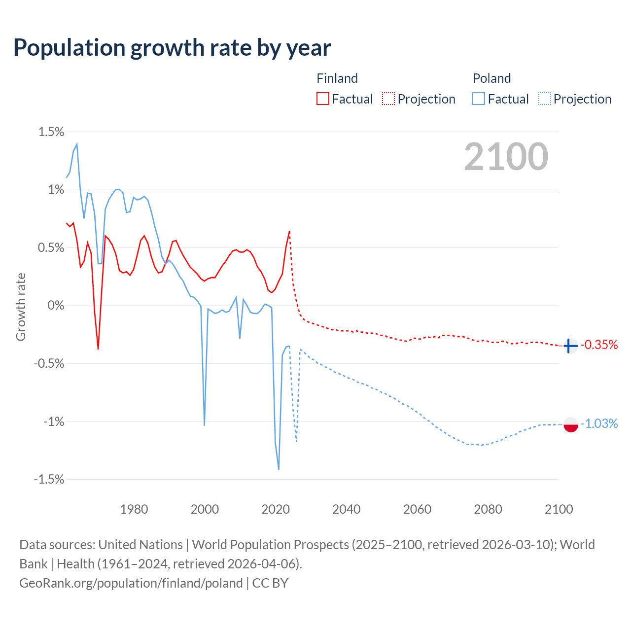 - For the last 10 years, Finland has had an average growth rate of +0.3% per year vs -0.36% in Poland.