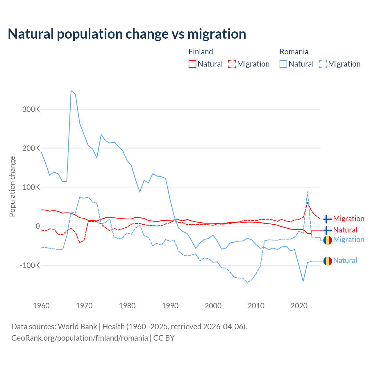 Over the last 10 years, 22.5% of the population change in Finland is from natural causes (a loss of 65,560 people) and 77.5% is from migration (a gain of 225,237 people). In Romania 82% is from natural causes (a loss of 766,295 people) and 18% is from migration (a loss of 167,917 people).