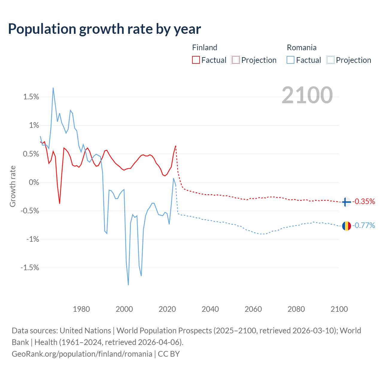 - For the last 10 years, Finland has had an average growth rate of +0.3% per year vs -0.43% in Romania.