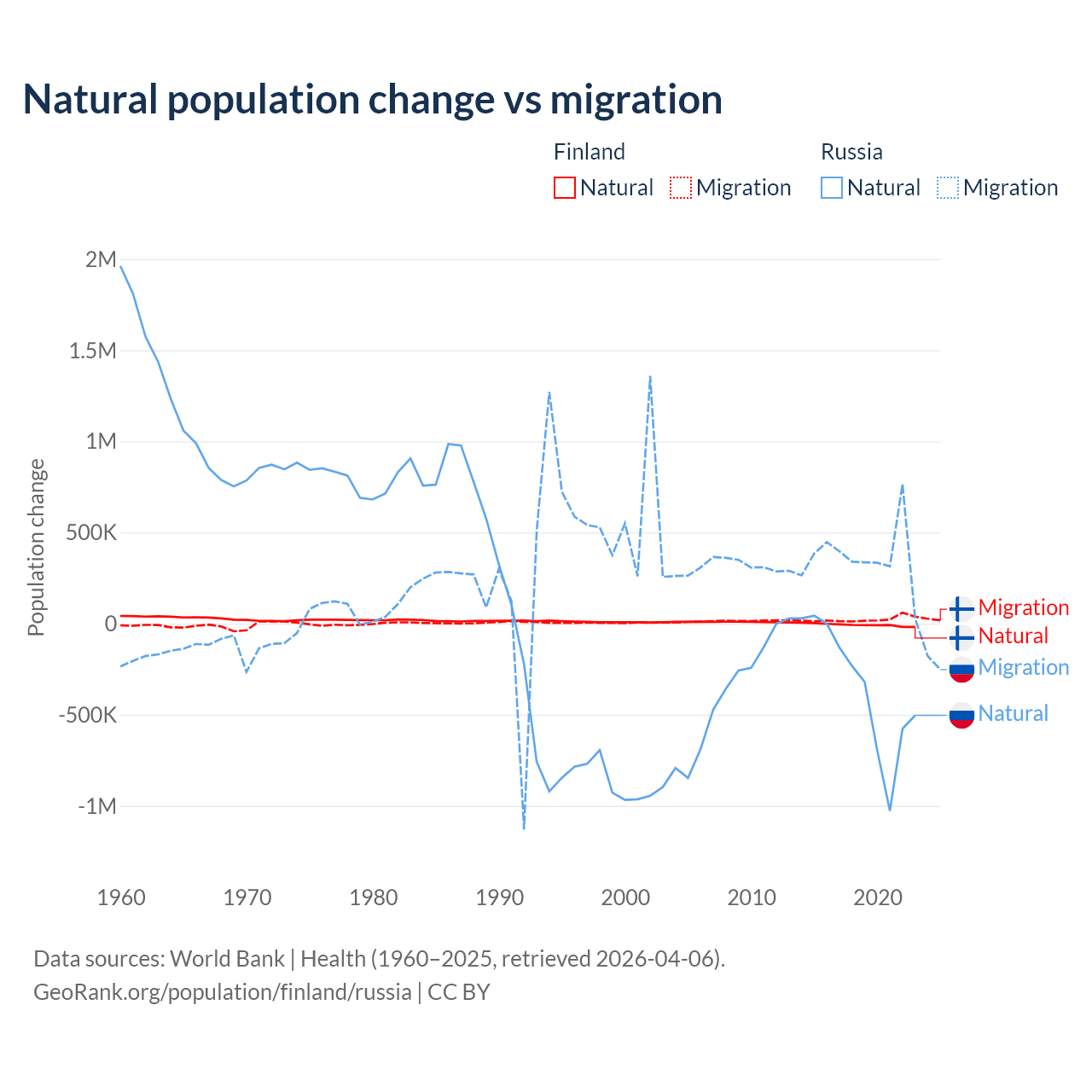 Over the last 10 years, 22.5% of the population change in Finland is from natural causes (a loss of 65,560 people) and 77.5% is from migration (a gain of 225,237 people). In Russia 48.6% is from natural causes (a loss of 3,416,377 people) and 51.4% is from migration (a gain of 3,611,826 people).