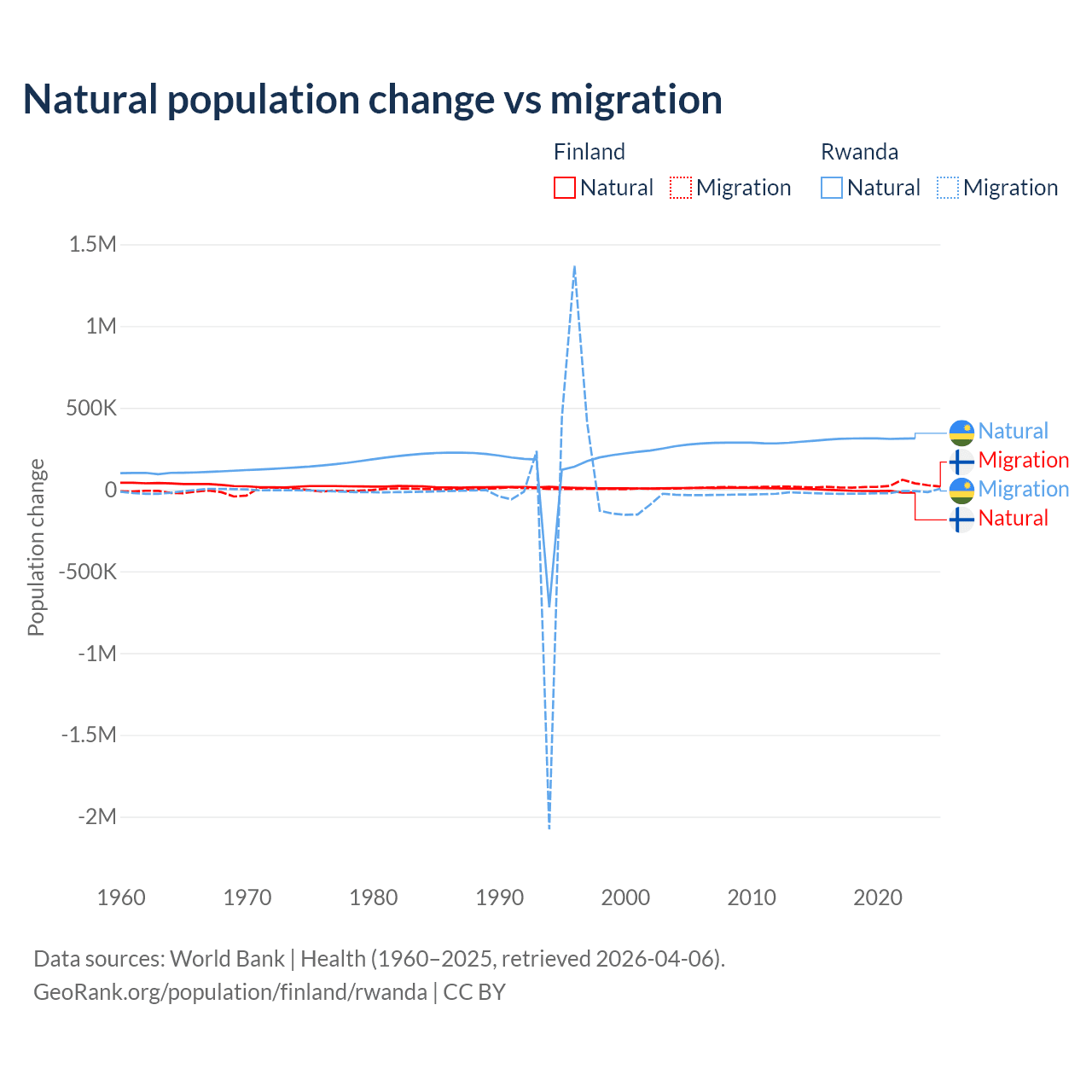 Over the last 10 years, 22.5% of the population change in Finland is from natural causes (a loss of 65,560 people) and 77.5% is from migration (a gain of 225,237 people). In Rwanda 93.8% is from natural causes (a gain of 3,081,296 people) and 6.18% is from migration (a loss of 203,035 people).