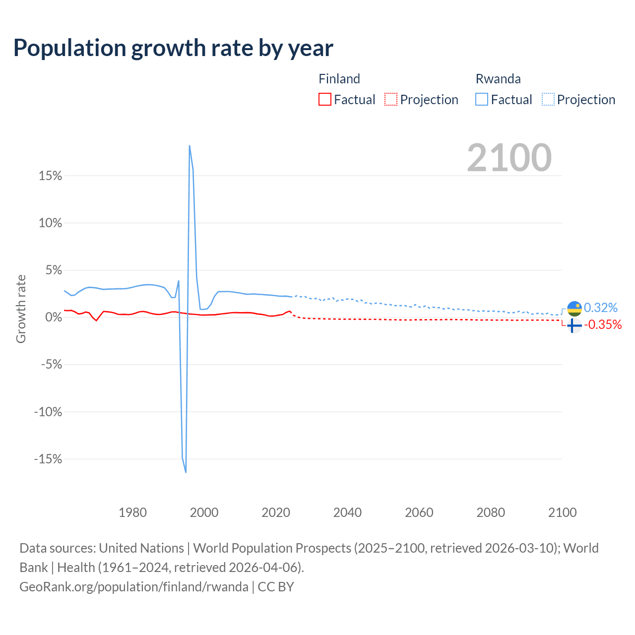 - For the last 10 years, Finland has had an average growth rate of +0.3% per year vs +2.31% in Rwanda.