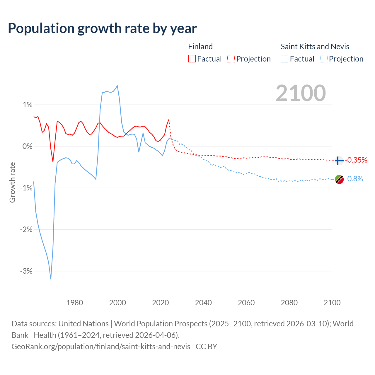 - For the last 10 years, Finland has had an average growth rate of +0.3% per year vs -0.04% in Saint Kitts and Nevis.