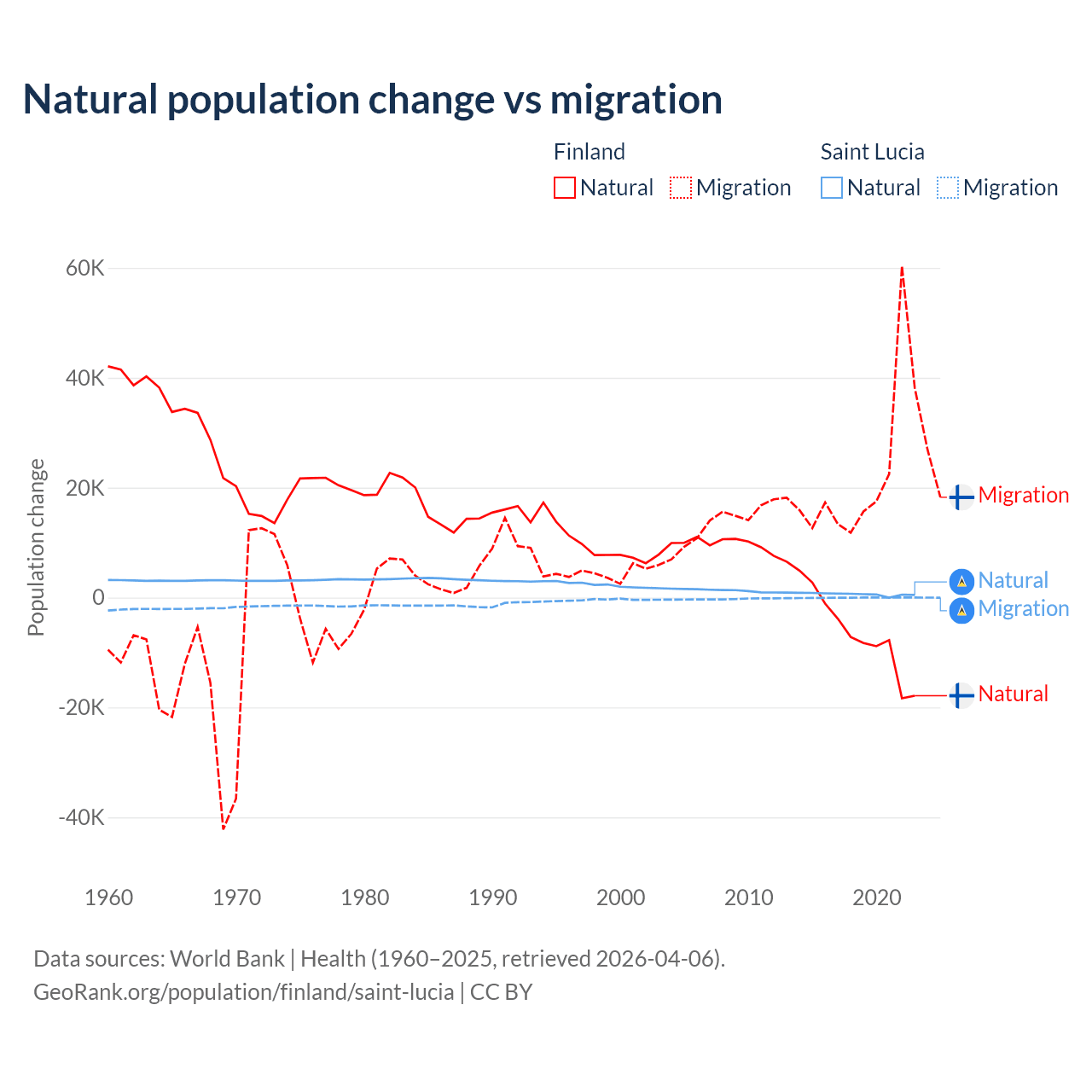Over the last 10 years, 22.5% of the population change in Finland is from natural causes (a loss of 65,560 people) and 77.5% is from migration (a gain of 225,237 people). In Saint Lucia 95.7% is from natural causes (a gain of 6,039 people) and 4.31% is from migration (a loss of 272 people).