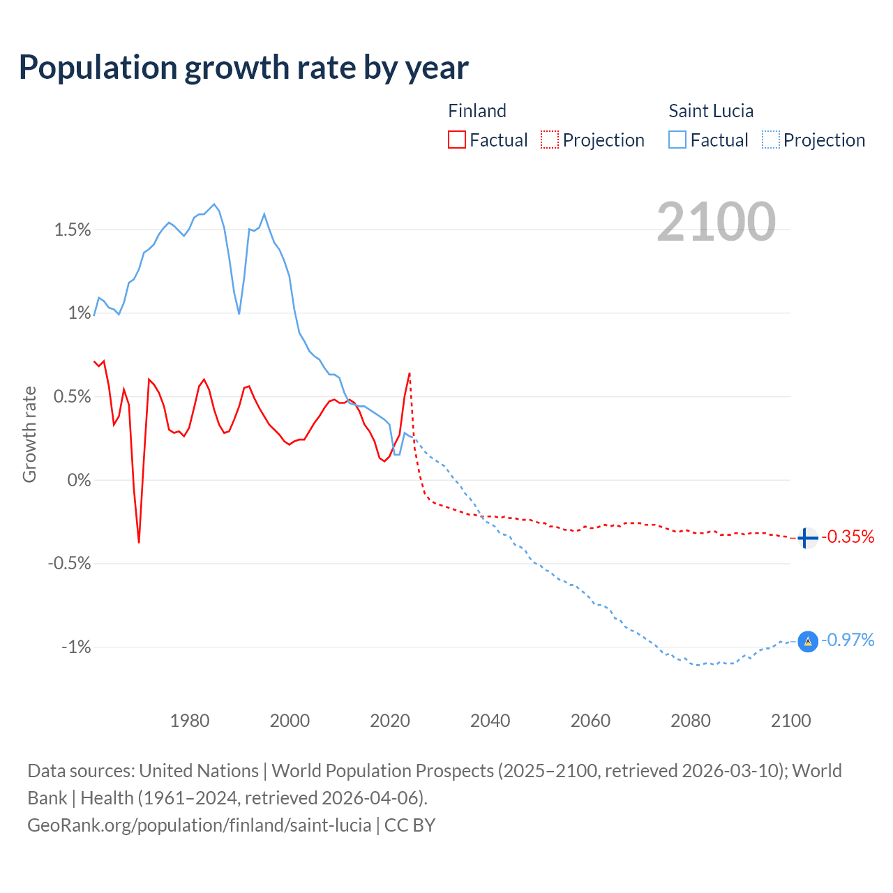 - For the last 10 years, Finland has had an average growth rate of +0.3% per year vs +0.33% in Saint Lucia.