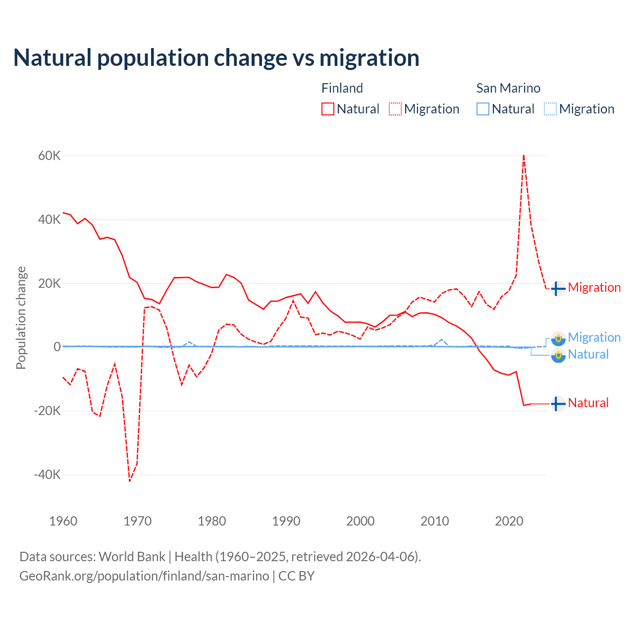 Over the last 10 years, 22.5% of the population change in Finland is from natural causes (a loss of 65,560 people) and 77.5% is from migration (a gain of 225,237 people). In San Marino 40.9% is from natural causes (a loss of 358 people) and 59.1% is from migration (a gain of 517 people).