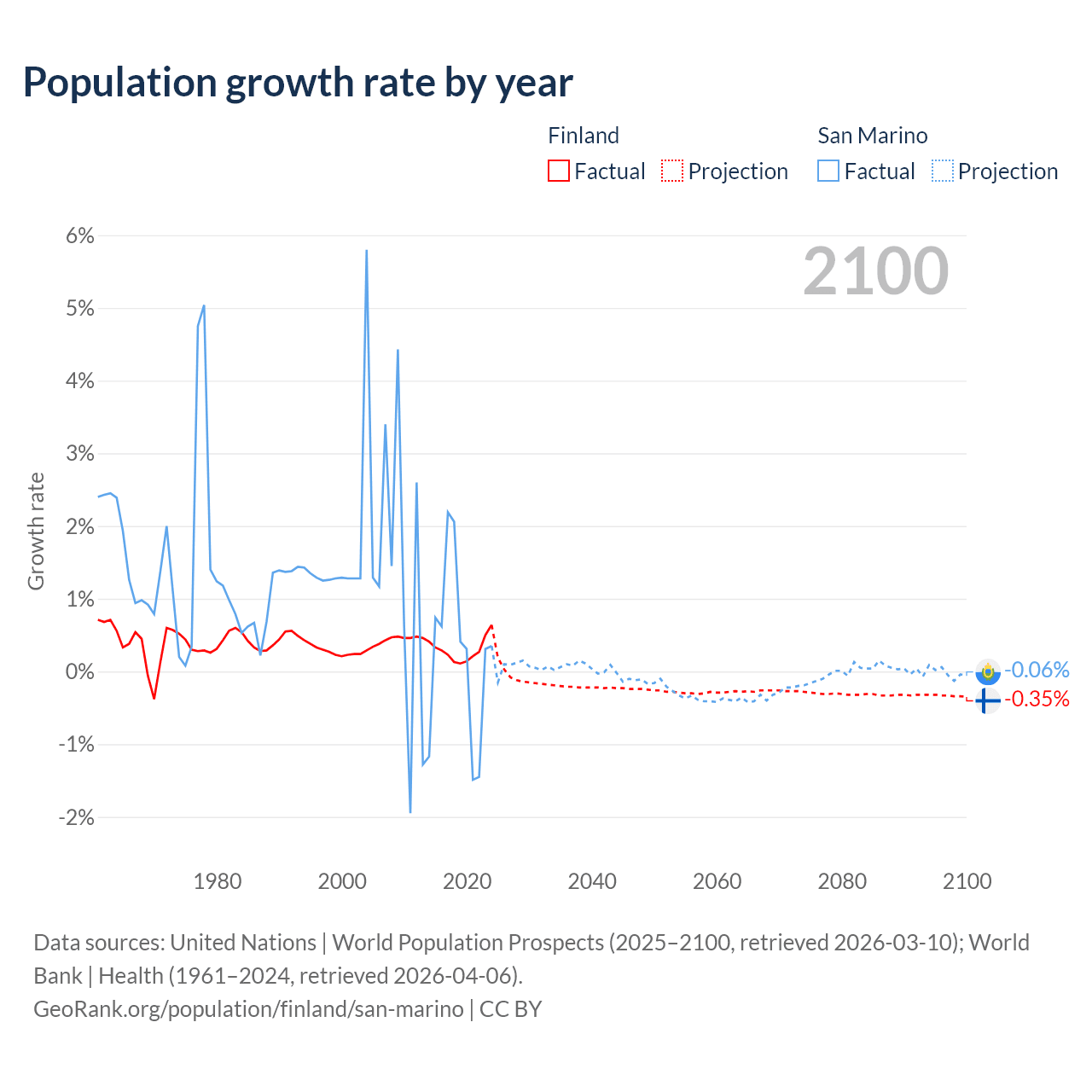 - For the last 10 years, Finland has had an average growth rate of +0.3% per year vs +0.26% in San Marino.