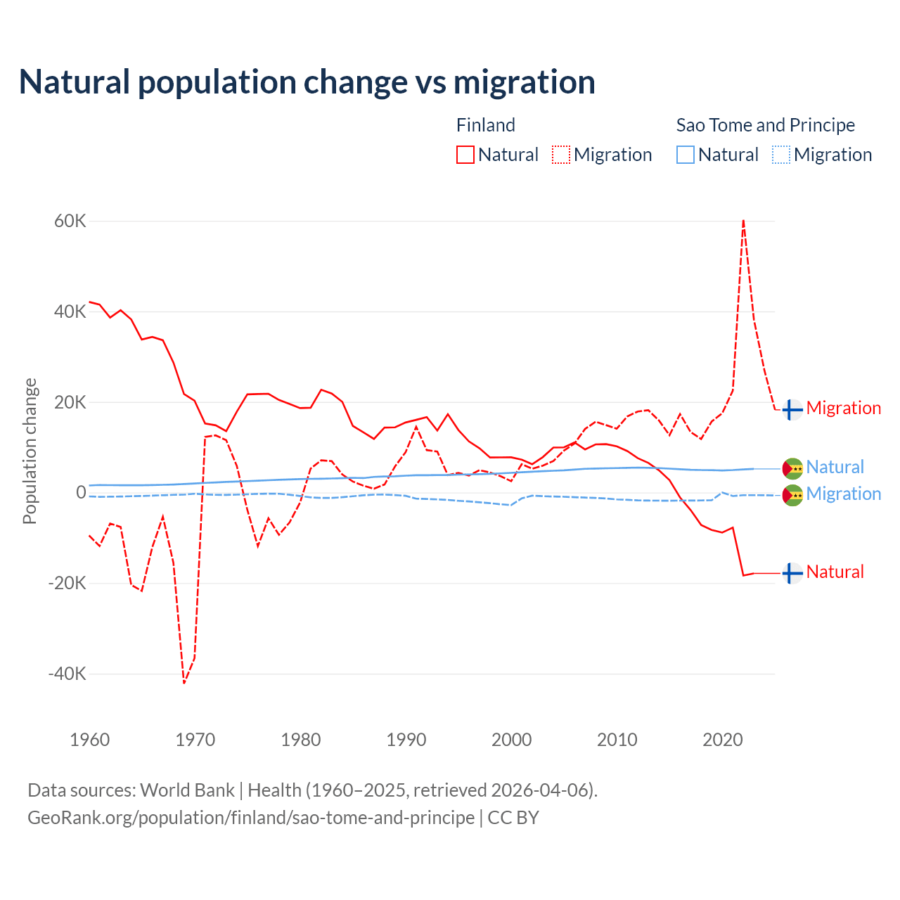 Over the last 10 years, 22.5% of the population change in Finland is from natural causes (a loss of 65,560 people) and 77.5% is from migration (a gain of 225,237 people). In Sao Tome and Principe 80.1% is from natural causes (a gain of 50,822 people) and 19.9% is from migration (a loss of 12,621 people).