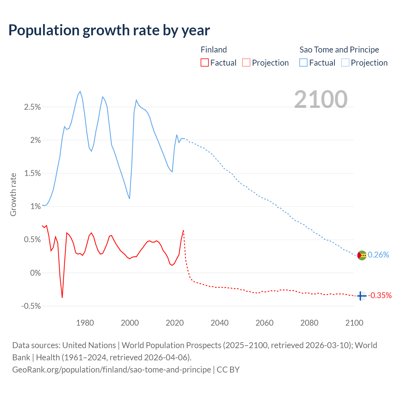 - For the last 10 years, Finland has had an average growth rate of +0.3% per year vs +1.82% in Sao Tome and Principe.