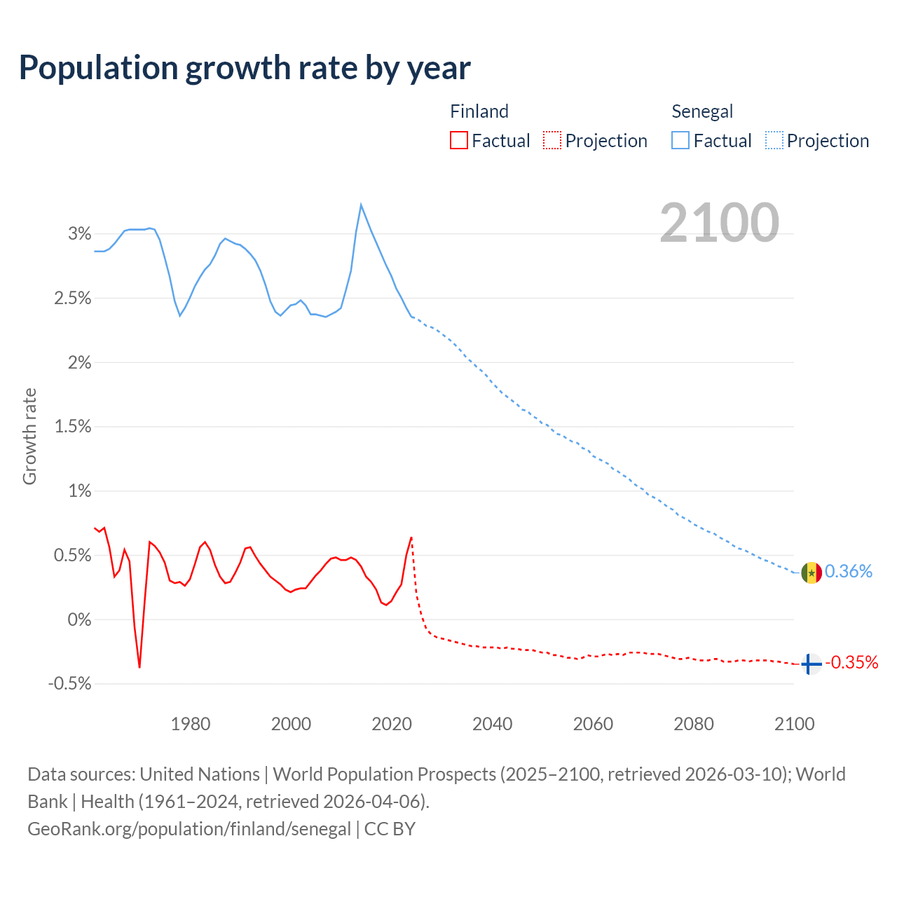 - For the last 10 years, Finland has had an average growth rate of +0.3% per year vs +2.76% in Senegal.