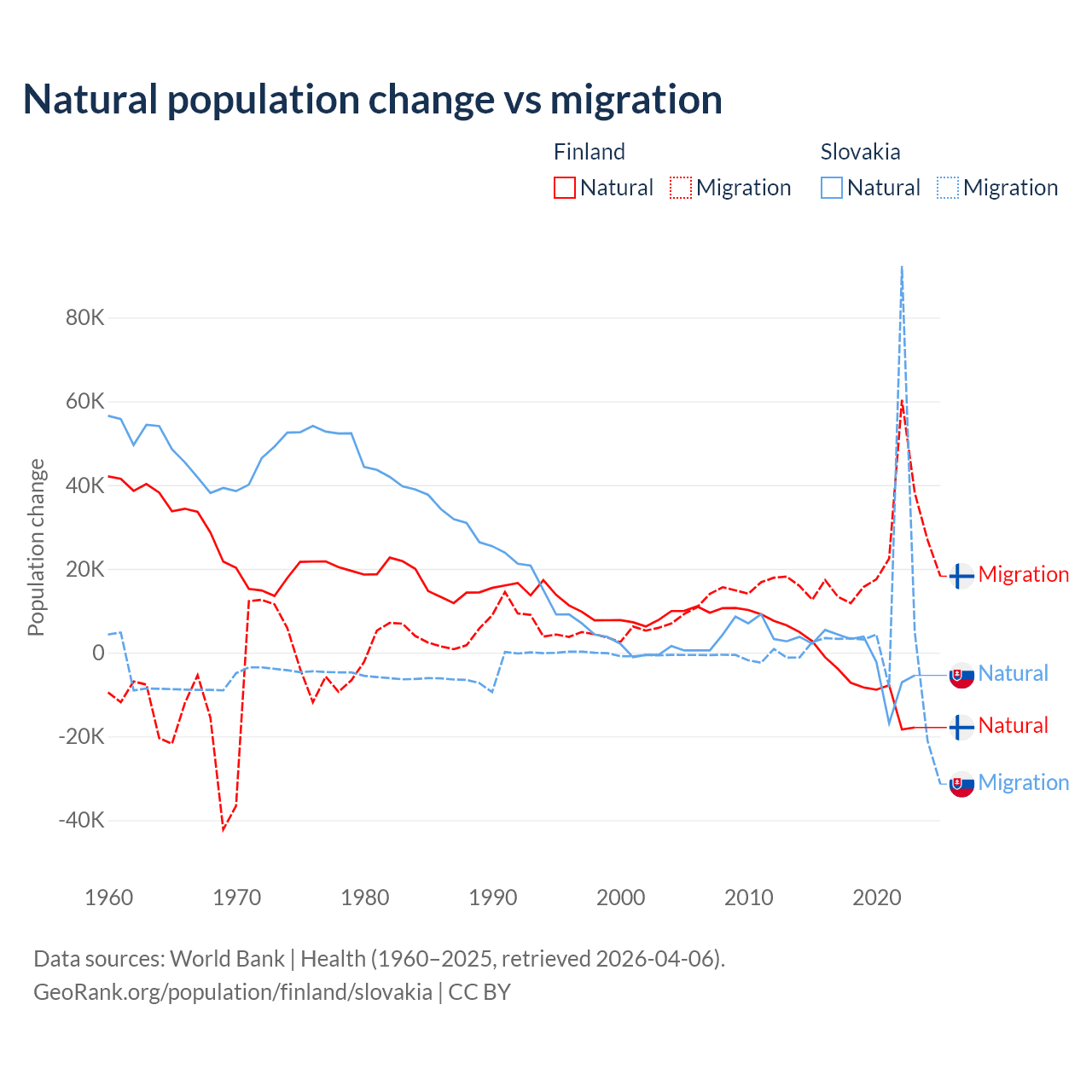 Over the last 10 years, 22.5% of the population change in Finland is from natural causes (a loss of 65,560 people) and 77.5% is from migration (a gain of 225,237 people). In Slovakia 7.47% is from natural causes (a loss of 8,728 people) and 92.5% is from migration (a gain of 108,156 people).