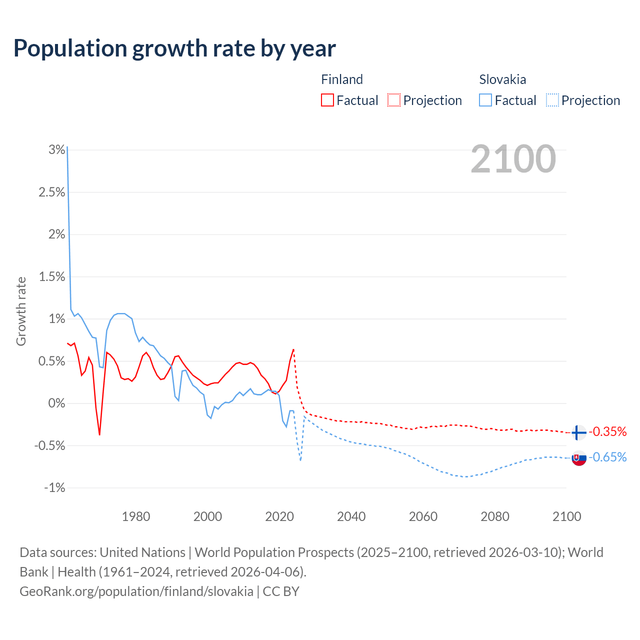 - For the last 10 years, Finland has had an average growth rate of +0.3% per year vs +0.01% in Slovakia.