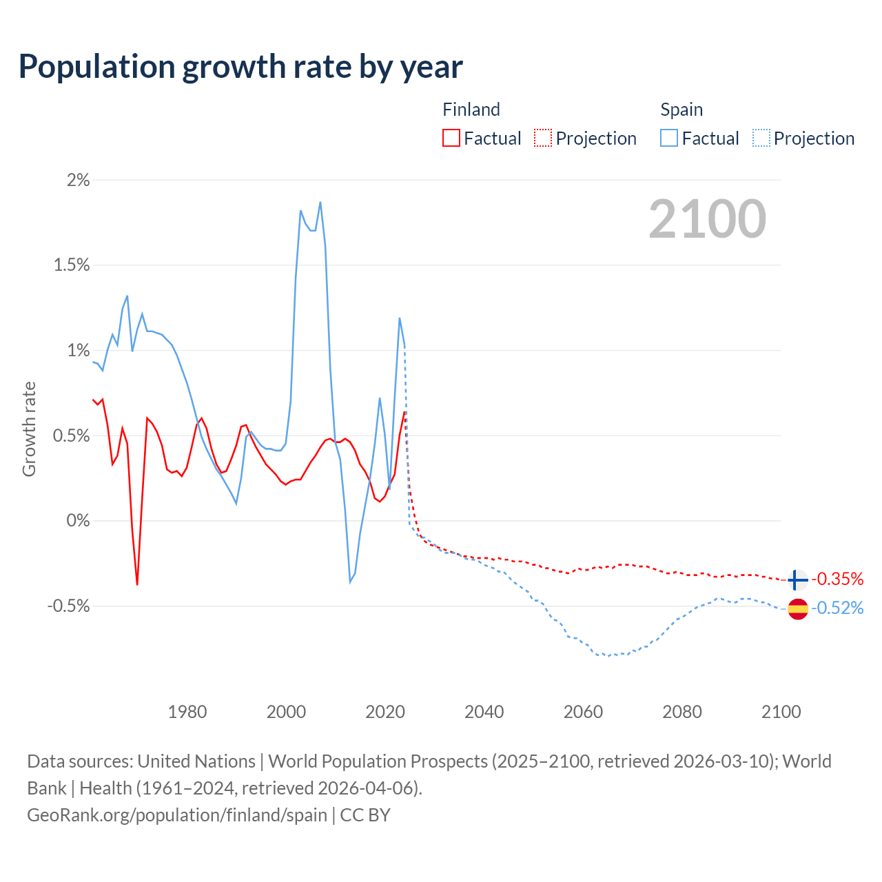 - For the last 10 years, Finland has had an average growth rate of +0.3% per year vs +0.43% in Spain.