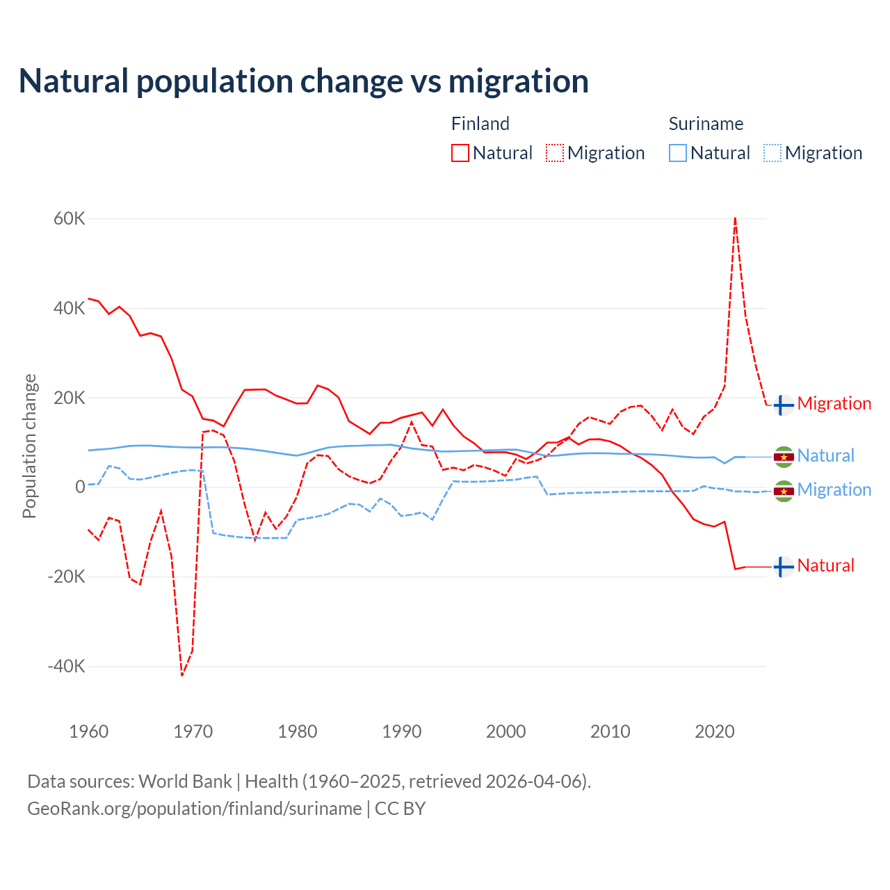 Over the last 10 years, 22.5% of the population change in Finland is from natural causes (a loss of 65,560 people) and 77.5% is from migration (a gain of 225,237 people). In Suriname 90.3% is from natural causes (a gain of 66,709 people) and 9.72% is from migration (a loss of 7,185 people).
