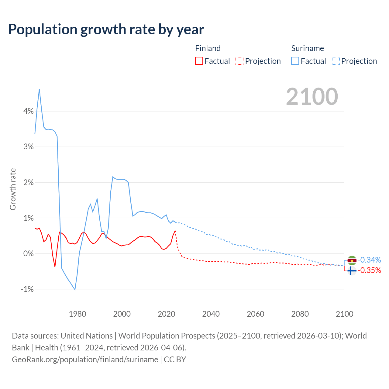 - For the last 10 years, Finland has had an average growth rate of +0.3% per year vs +0.99% in Suriname.