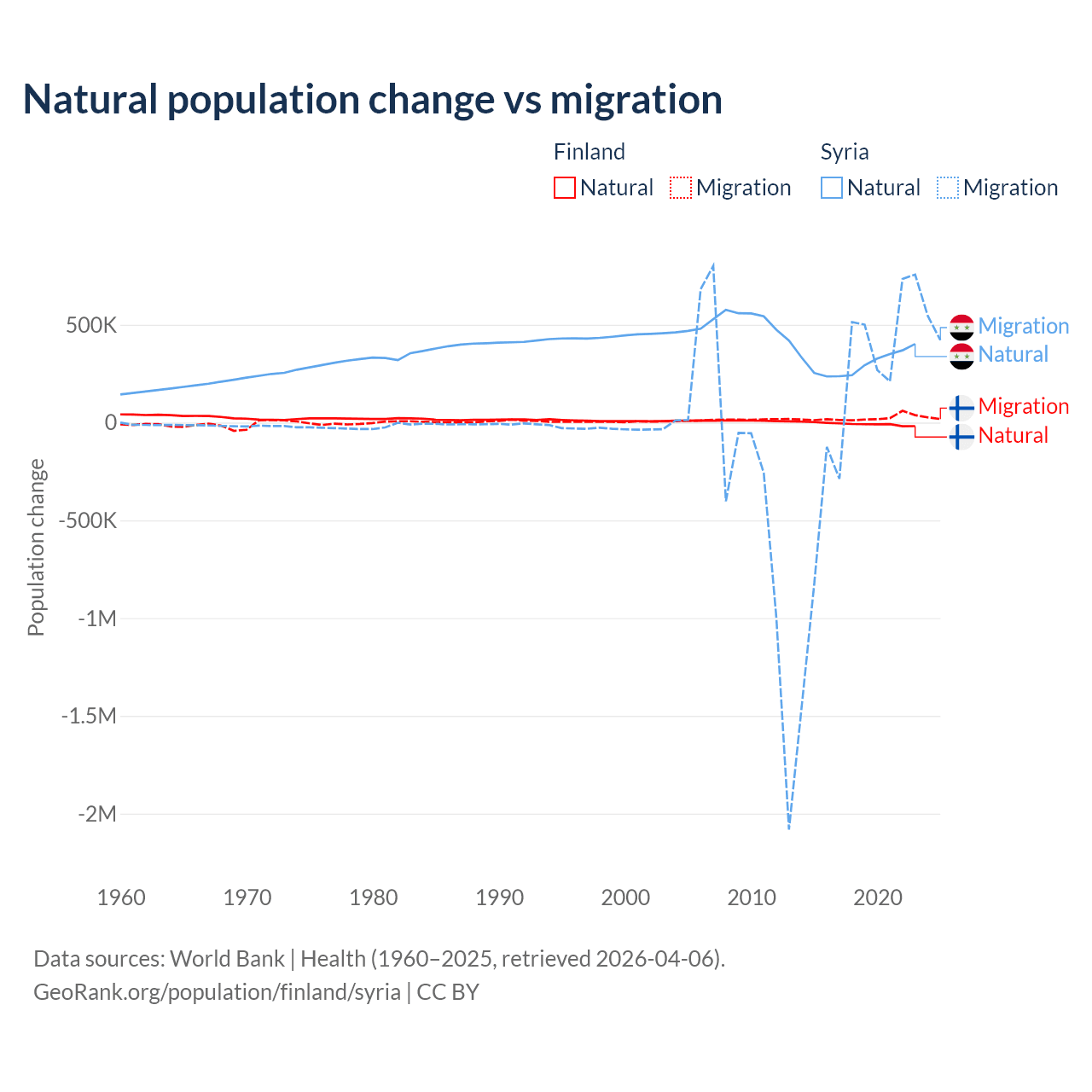 Over the last 10 years, 22.5% of the population change in Finland is from natural causes (a loss of 65,560 people) and 77.5% is from migration (a gain of 225,237 people). In Syria 91.3% is from natural causes (a gain of 3,047,621 people) and 8.72% is from migration (a gain of 291,069 people).
