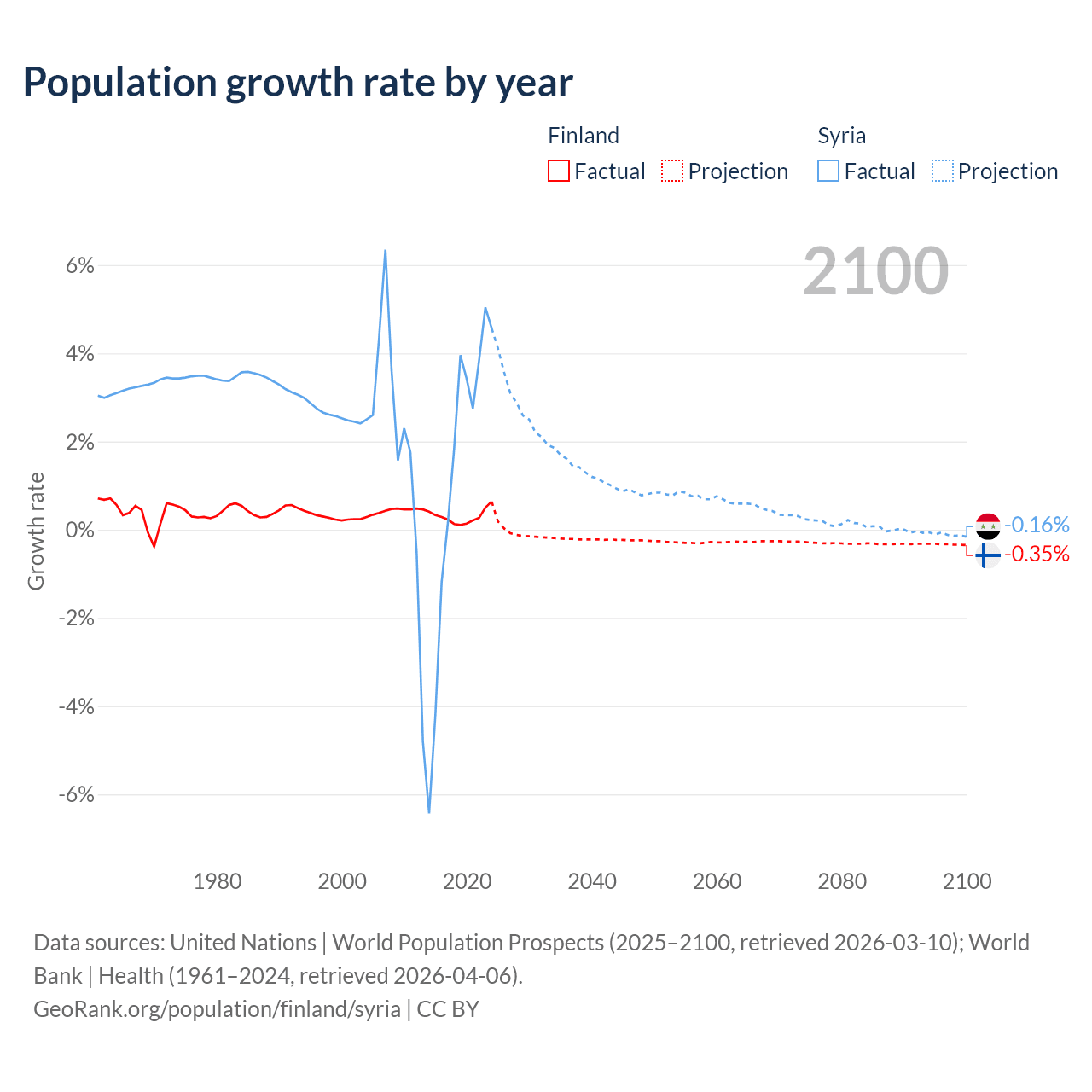 - For the last 10 years, Finland has had an average growth rate of +0.3% per year vs +1.25% in Syria.