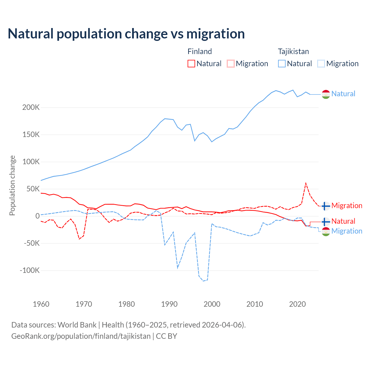 Over the last 10 years, 22.5% of the population change in Finland is from natural causes (a loss of 65,560 people) and 77.5% is from migration (a gain of 225,237 people). In Tajikistan 96% is from natural causes (a gain of 2,266,045 people) and 3.95% is from migration (a loss of 93,205 people).