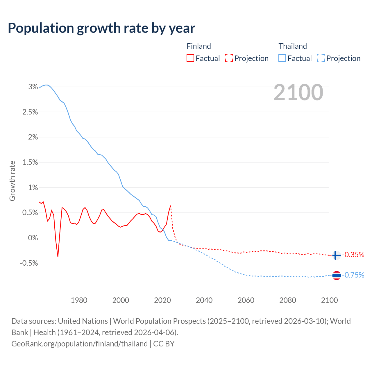 - For the last 10 years, Finland has had an average growth rate of +0.3% per year vs +0.23% in Thailand.