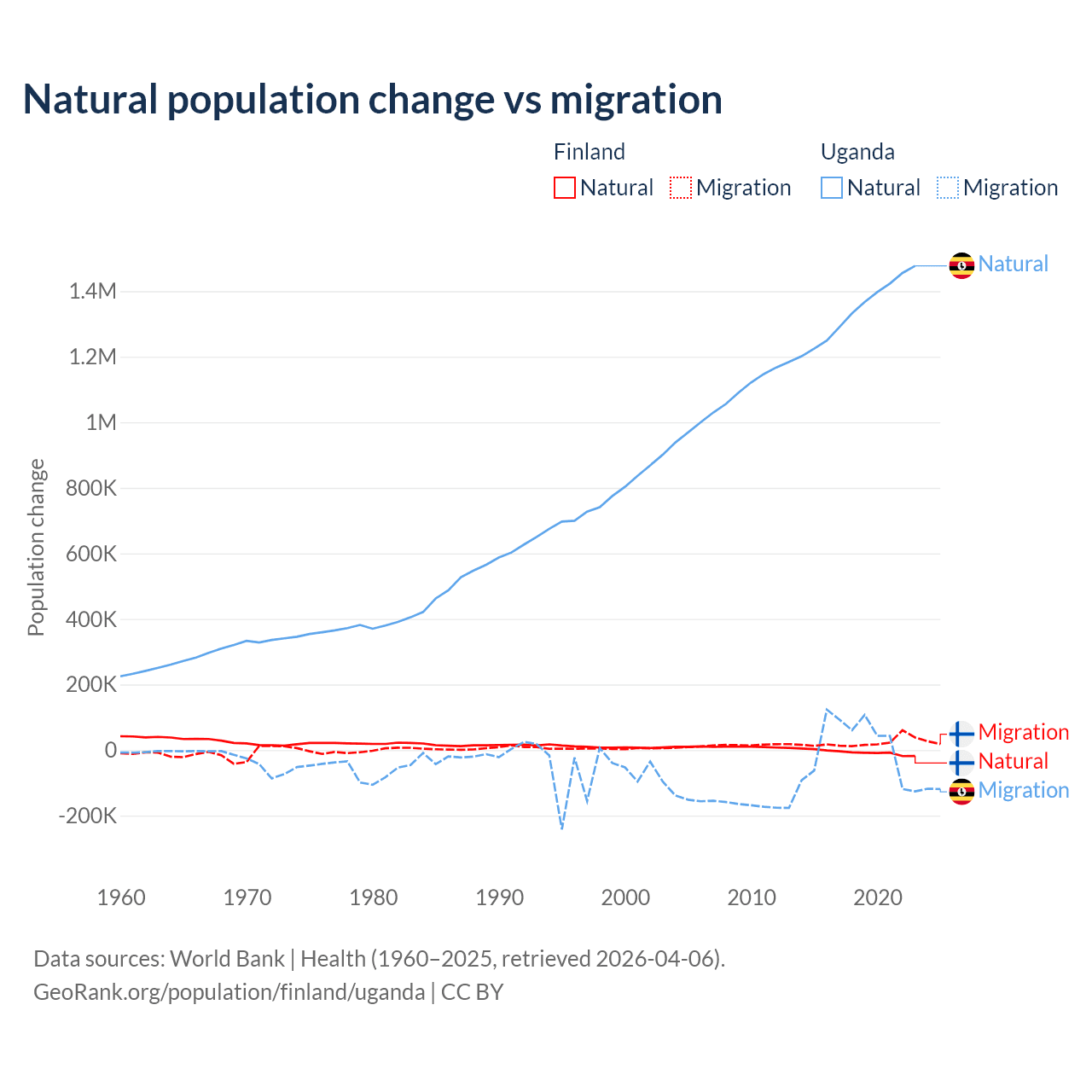 Over the last 10 years, 22.5% of the population change in Finland is from natural causes (a loss of 65,560 people) and 77.5% is from migration (a gain of 225,237 people). In Uganda 99.5% is from natural causes (a gain of 13,419,712 people) and 0.53% is from migration (a gain of 71,457 people).