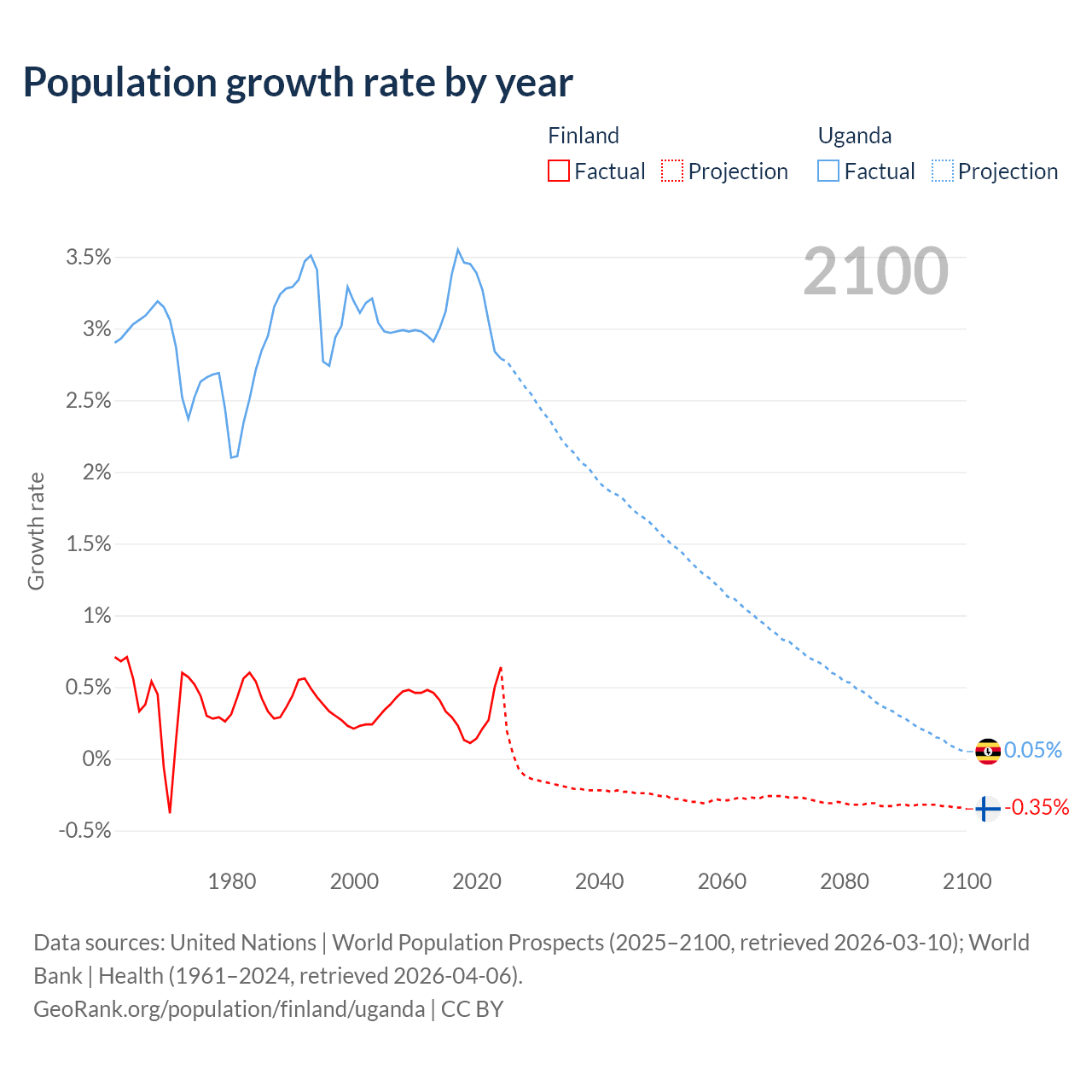 - For the last 10 years, Finland has had an average growth rate of +0.3% per year vs +3.21% in Uganda.
