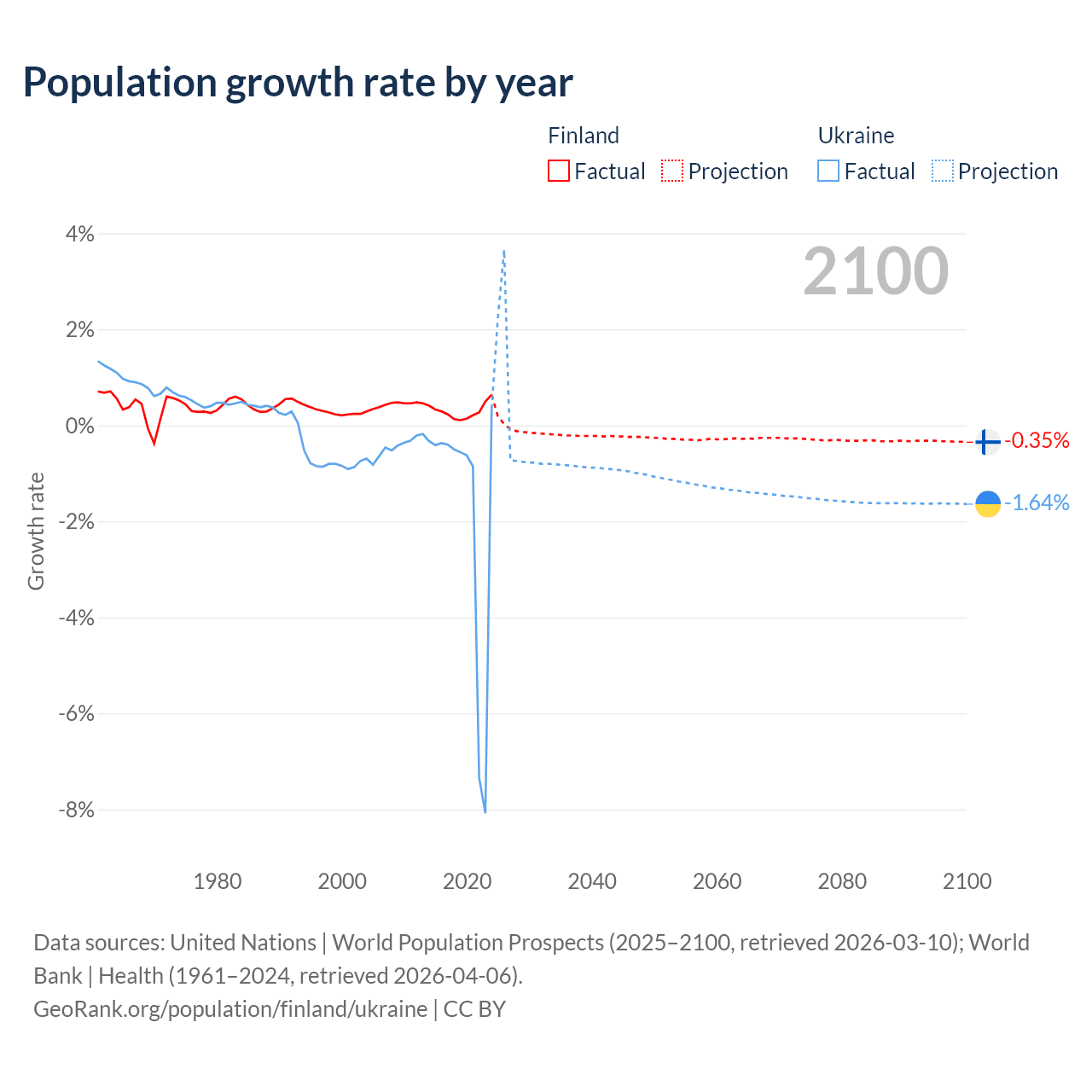 - For the last 10 years, Finland has had an average growth rate of +0.3% per year vs -1.74% in Ukraine.