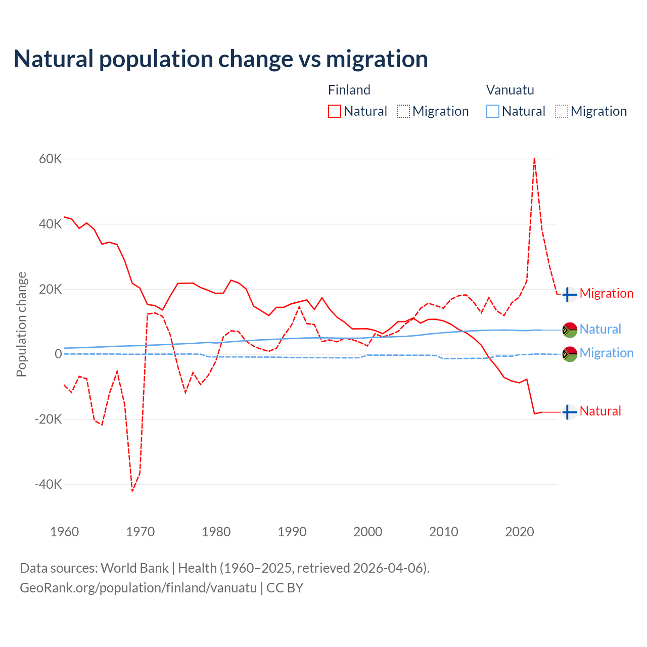 Over the last 10 years, 22.5% of the population change in Finland is from natural causes (a loss of 65,560 people) and 77.5% is from migration (a gain of 225,237 people). In Vanuatu 92.2% is from natural causes (a gain of 72,941 people) and 7.81% is from migration (a loss of 6,181 people).